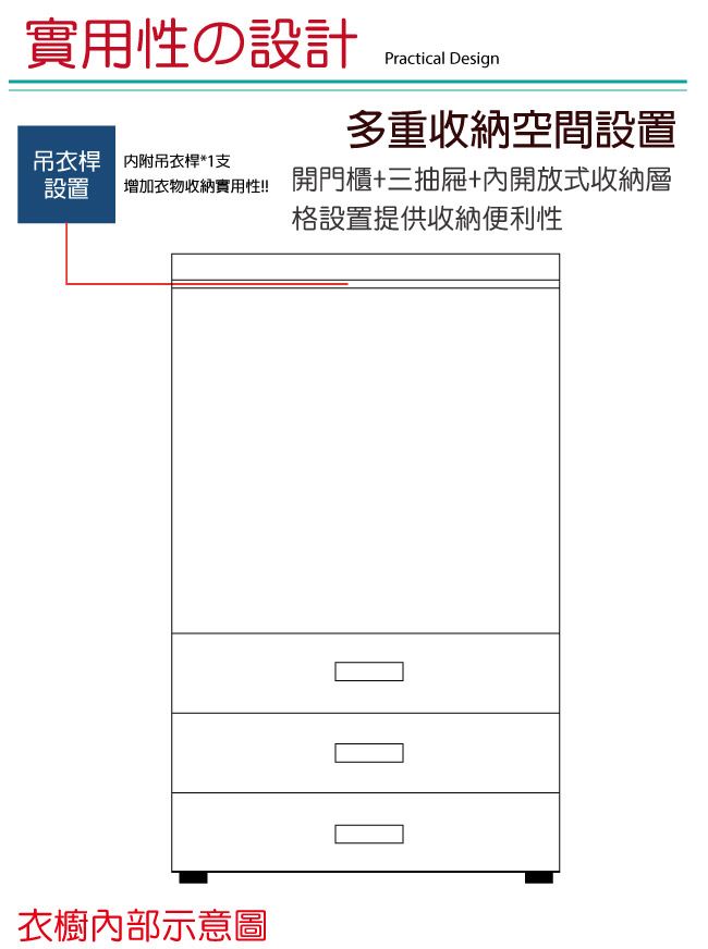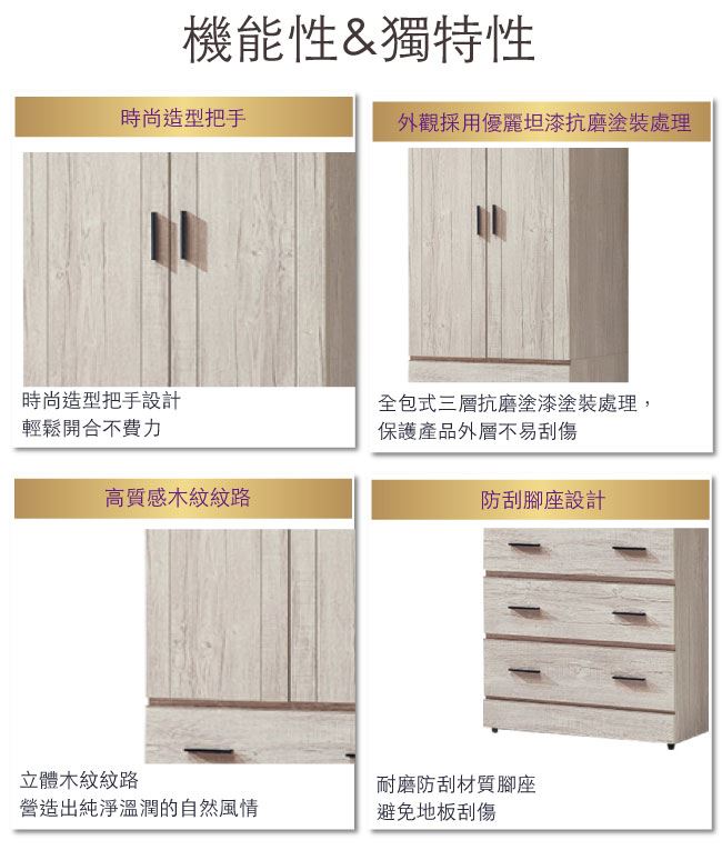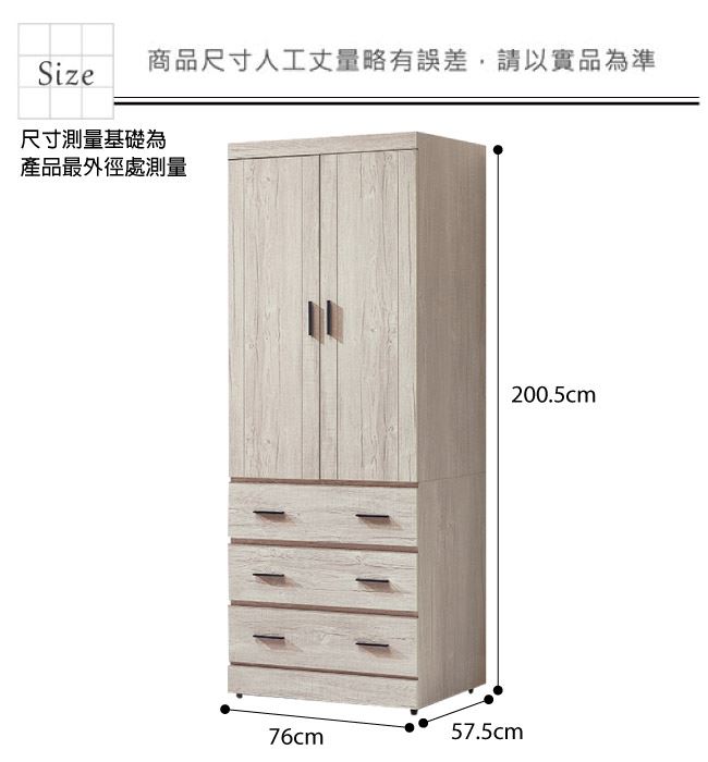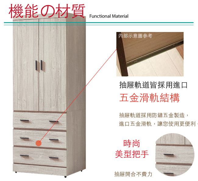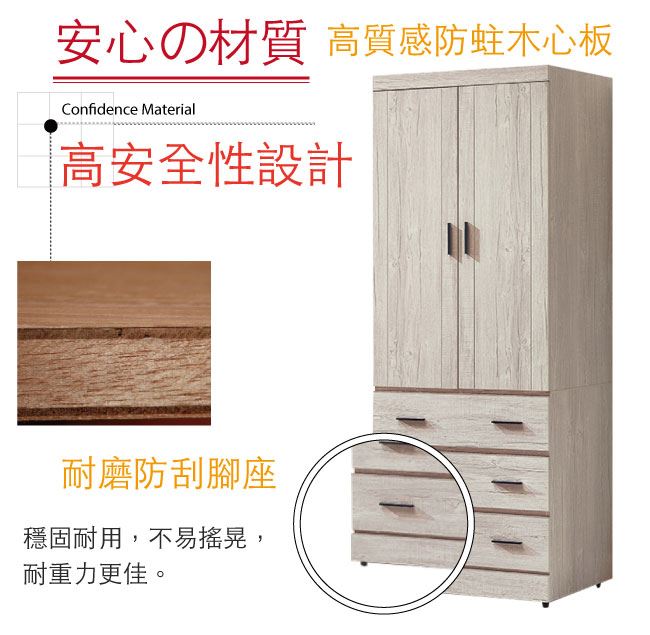材質 | ◆產品名稱:【綠家居】德里 現代2.5尺開門三抽衣櫃/收納櫃 產品尺寸: 尺寸:(寬)76x(深)57.5x(高)200.5/公分 ◆材質: 材質:防蛀木心板+耐磨防刮腳座 材質:五金滑軌結構 塗漆:優利坦三層全包式耐磨塗漆塗裝處理 |