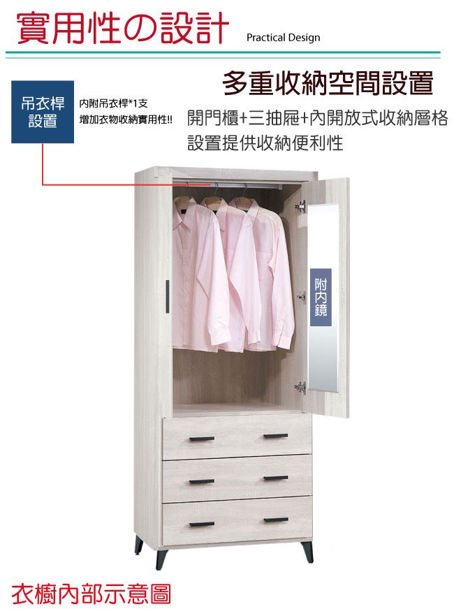 【綠家居】邁尼耶 時尚2.7尺二門三抽衣櫃/收納櫃