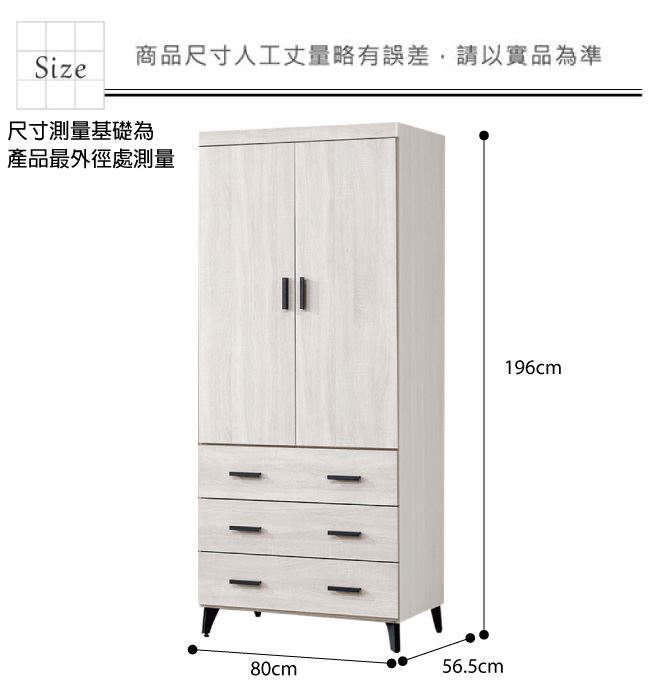 材質 | ◆產品名稱:【綠家居】邁尼耶 時尚2.7尺二門三抽衣櫃/收納櫃 尺寸:(寬)80x(深)56.5x(高)196/公分 ◆材質: 材質:防蛀木心板+五金滑軌結構+防潮黑漆腳座+防夾手緩衝門片五金+強化玻璃鏡面 |
