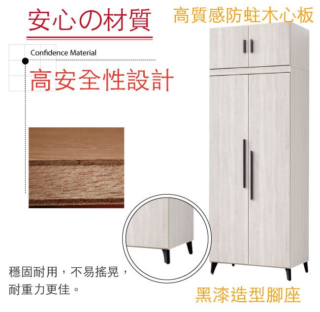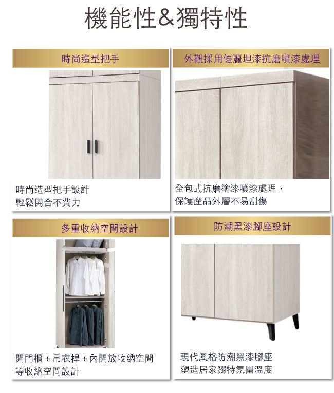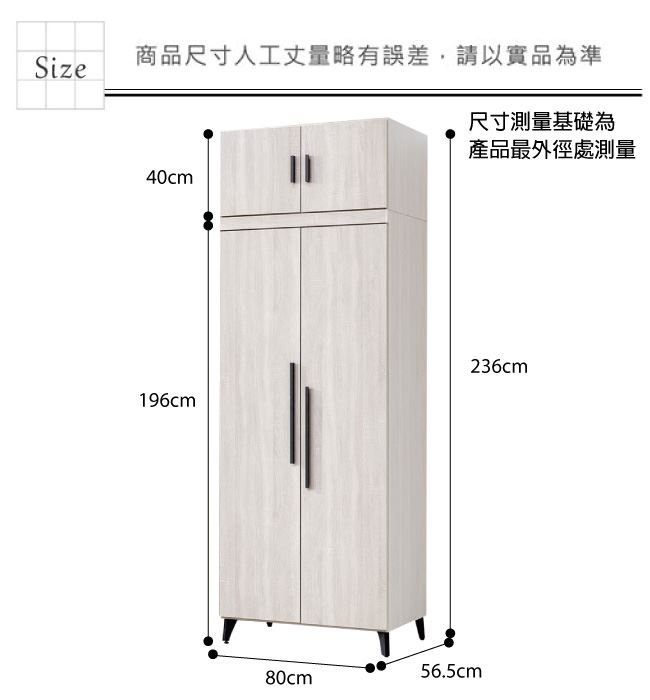 材質 | ◆產品名稱:【綠家居】邁尼耶 時尚2.7尺四門雙吊加高衣櫃/收納櫃 尺寸:(寬)80x(深)56.5x(高)236/公分 ◆材質: 材質:防蛀木心板+防潮黑漆腳座+防夾手緩衝門片五金 |