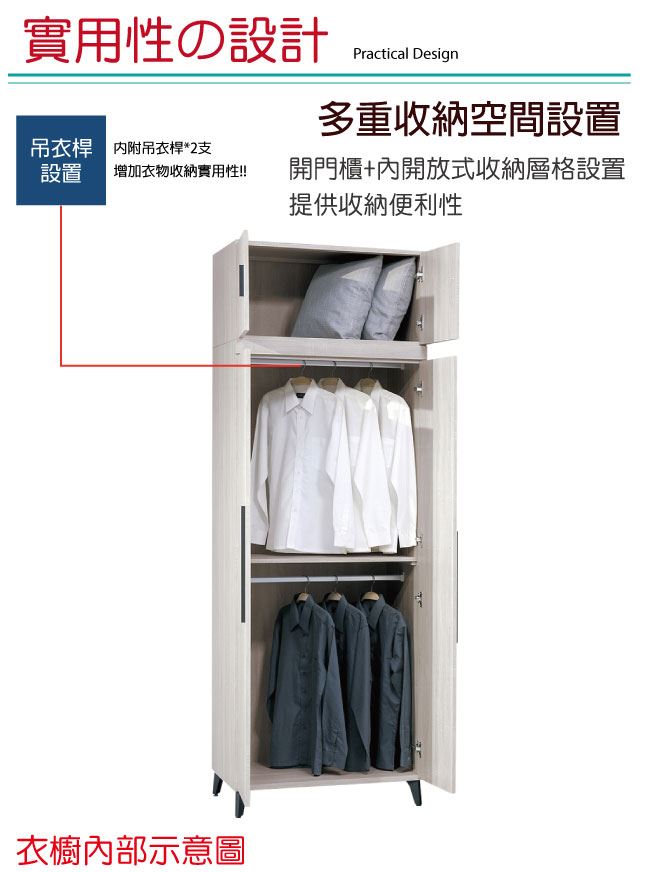 - 開門櫃+吊衣桿+內開放式收納