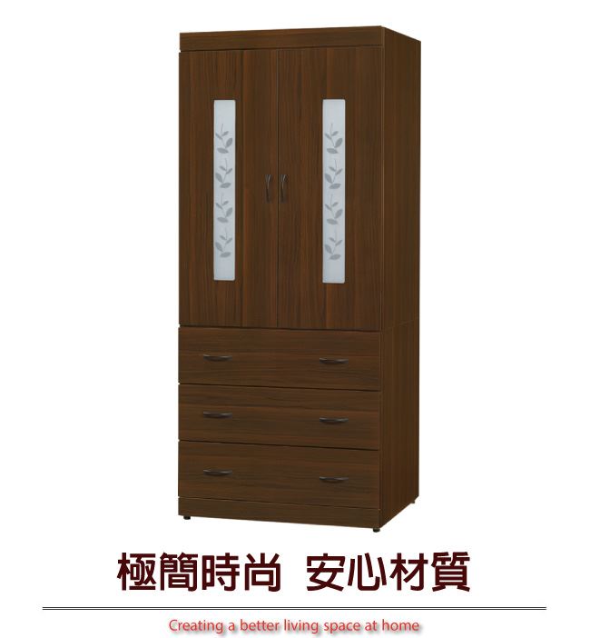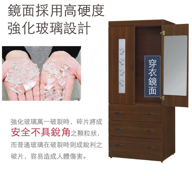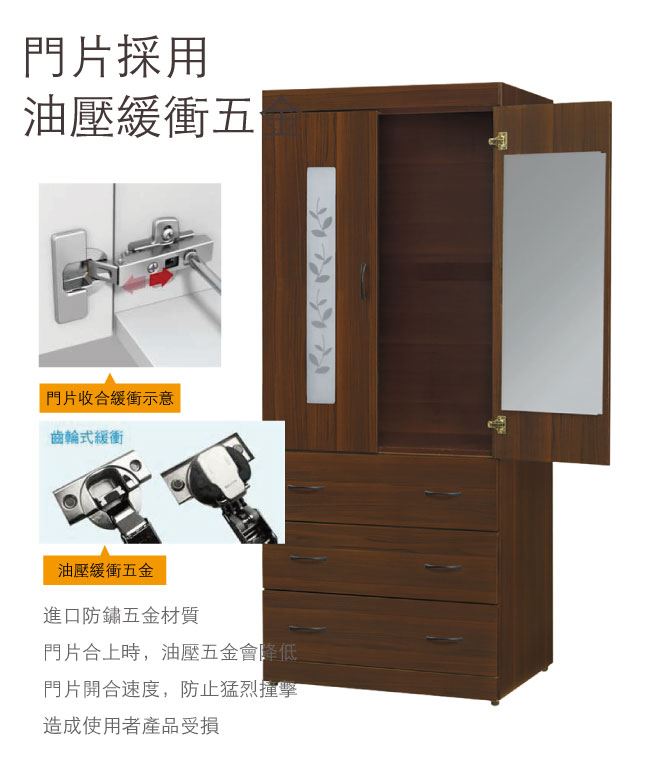 商品介紹 | 【綠家居】姆維亞 時尚2.7尺二門三抽衣櫃/收納櫃(附穿衣鏡面) 胡桃木紋色系+現代簡約風格+安心材質製造,整體採用防蛀木心板+五金滑軌結構+防潮黑漆腳座+防夾手緩衝門片五金等安心材質製造,搭配採用開門櫃+吊衣桿+三抽屜+穿衣鏡面設置+內開放式收納層格等收納空間設計,全由專人配送到家,專業安心服務,替你省下更多時間! 【商品特色】 胡桃木紋色系+現代簡約風格+安心材質製造,使用放心+搭配居家更便利 採用防蛀木心板+五金滑軌結構+防潮黑漆腳座+防夾手緩衝門片五金等安心材質製造 採用開門櫃+吊衣桿+三抽屜+穿衣鏡面設置+內開放式收納層格等收納空間設計 此商品不需要DIY組立,此商品為組立後之成品 品質保證、專業設計、貼心服務 全由專人配送到家,專業安心服務,替您省下更多時間 |