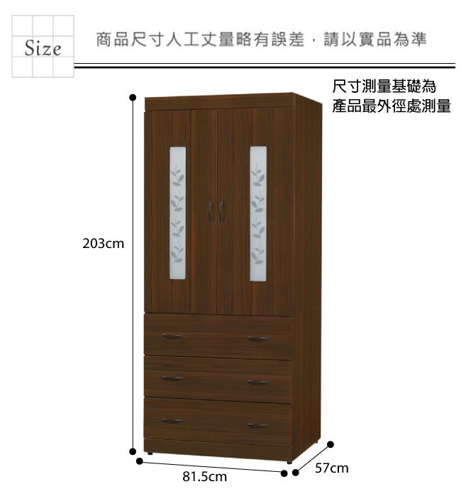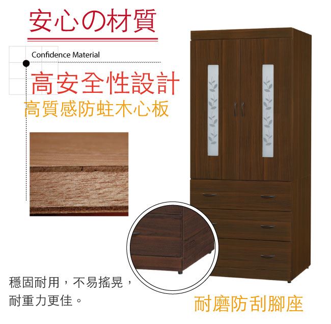 材質 | ◆產品名稱:【綠家居】姆維亞 時尚2.7尺二門三抽衣櫃/收納櫃(附穿衣鏡面) 尺寸:(寬)81.5(深)57x(高)203/公分 ◆材質: 材質:防蛀木心板+五金滑軌結構+防潮黑漆腳座+防夾手緩衝門片五金 |