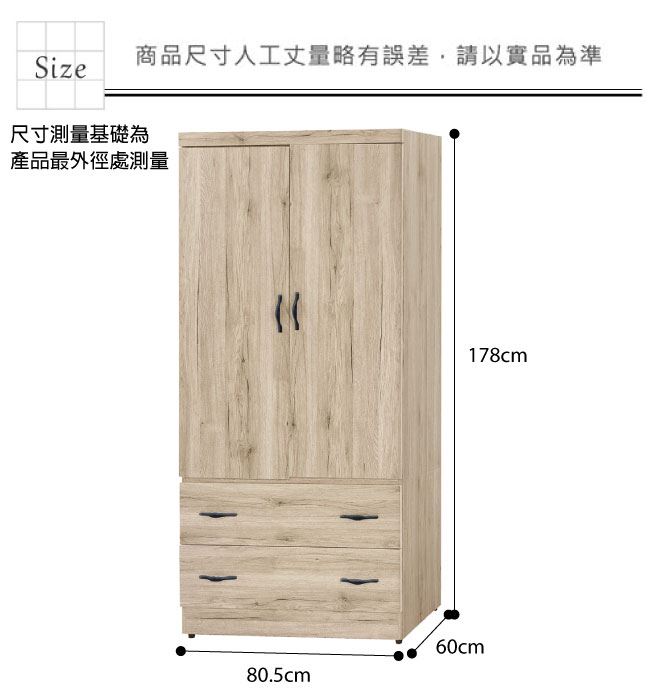 材質 | ◆產品名稱: 【綠家居】亞爾 木紋2.7尺二抽二門衣櫃/收納櫃 尺寸:(寬)80.5x(深)60x(高)178/公分 ◆材質: 材質:防蛀木心板+防潮耐磨腳座+五金滑軌結構+防夾手緩衝門片五金 噴漆:防潮耐磨噴漆處理