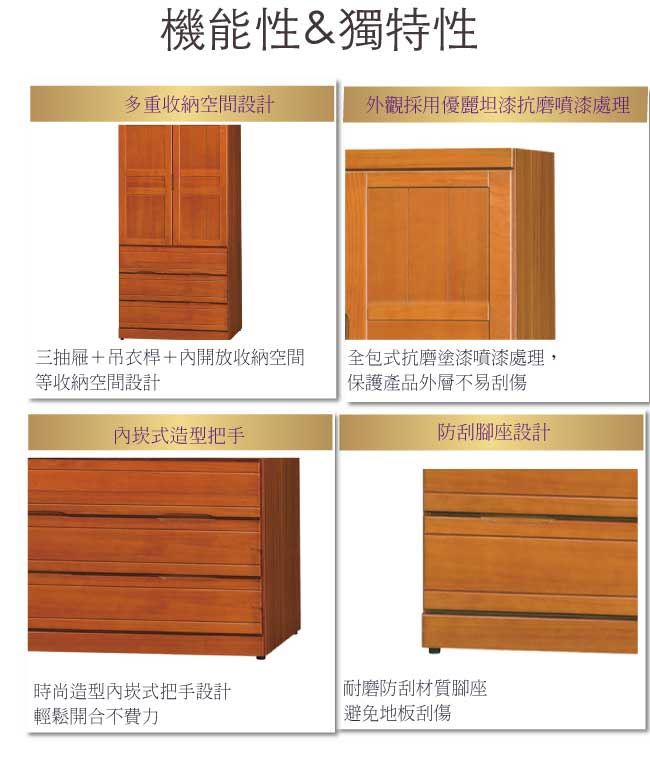 商品介紹 | 【綠家居】柏菲 二門2.9尺三抽衣櫃(二色可選) 二色可選+現代簡約風格+安心材質製造,整體採用防蛀木心板+防潮耐磨腳座+五金滑軌結構+防夾手緩衝門片五金等安心材質製造,產品外層採用防潮耐磨噴漆處理搭配採用開門櫃+吊衣桿+三抽屜內開放式層格等收納空間設計,全由專人配送到家,專業安心服務,替你省下更多時間! 【商品特色】 二色可選+現代簡約風格+安心材質製造,使用放心+搭配居家更便利 採用防蛀木心板+防潮耐磨腳座+五金滑軌結構+防夾手緩衝門片五金等安心材質製造 產品外層採用防潮耐磨噴漆處理 搭配採用開門櫃+吊衣桿+三抽屜+內開放式層格等收納空間設計 此商品不需要DIY組立,此商品為組立後之成品 品質保證、專業設計、貼心服務 全由專人配送到家,專業安心服務,替您省下更多時間 |