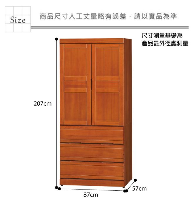 材質 | ◆產品名稱: 【綠家居】柏菲 二門2.9尺三抽衣櫃(二色可選) 尺寸:(寬)87x(深)57x(高)207/公分 ◆材質: 材質:防蛀木心板+防潮耐磨腳座+五金滑軌結構+防夾手緩衝門片五金 噴漆:防潮耐磨噴漆處理
