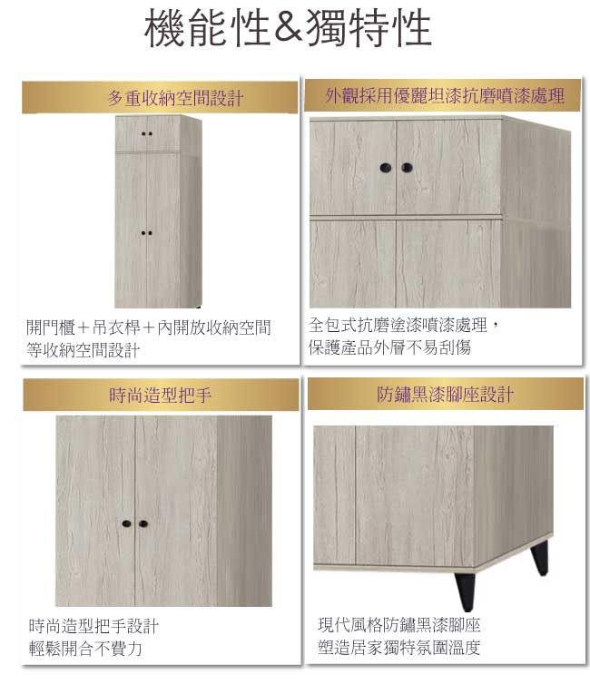 商品介紹 | 【綠家居】提菲芮 加高2.6尺四門衣櫃/收納櫃組合 淺橡木紋色系+現代簡約風格+安心材質製造,整體採用防蛀木心板+黑鐵砂腳座+防夾手緩衝門片五金等安心材質製造,外層採用全包式防潮耐磨噴漆處理搭配採用開門櫃+吊衣桿+內開放式收納層格等收納空間設計,全由專人配送到家,專業安心服務,替你省下更多時間! 【商品特色】 淺橡木紋色系+現代簡約風格+安心材質製造,使用放心+搭配居家更便利 採用防蛀木心板+黑鐵砂腳座+防夾手緩衝門片五金等安心材質製造 採用開門櫃+吊衣桿+內開放式收納層格等收納空間設計 此商品不需要DIY組立,此商品為組立後之成品 品質保證、專業設計、貼心服務 全由專人配送到家,專業安心服務,替您省下更多時間 |