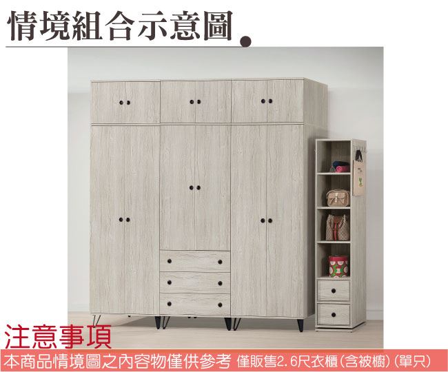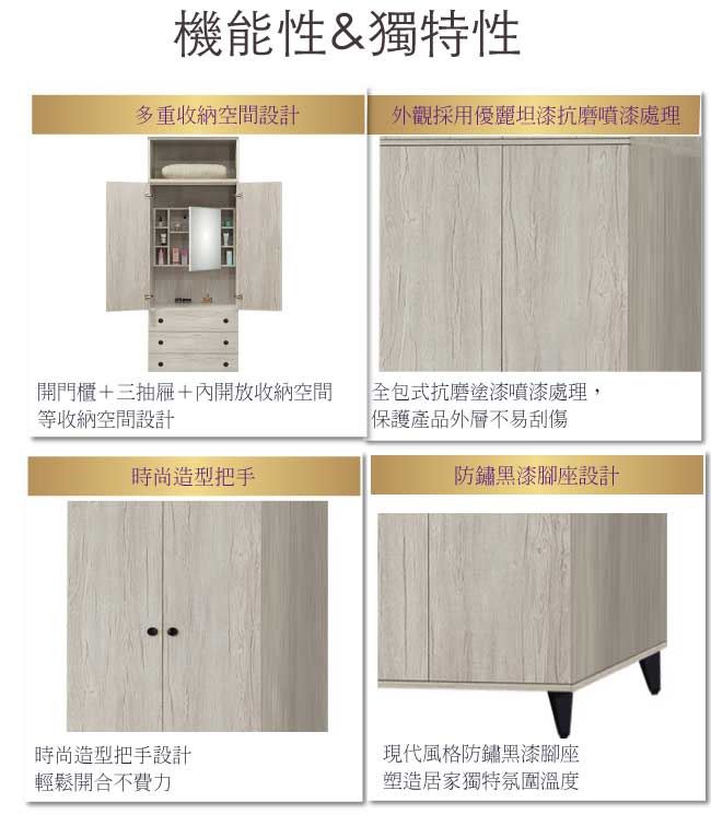 商品介紹 | 【綠家居】提菲芮 加高2.6尺四門三抽衣櫃/收納櫃組合(內含化妝鏡面櫃設置) 淺橡木紋色系+現代簡約風格+安心材質製造,整體採用防蛀木心板+黑鐵砂腳座+防夾手緩衝門片五金+五金滑軌結構+強化玻璃鏡面等安心材質製造,外層採用全包式防潮耐磨噴漆處理搭配採用開門櫃+吊衣桿+三抽屜+內開放式收納層格+內含可開合使用化妝鏡面櫃設置等收納空間設計,全由專人配送到家,專業安心服務,替你省下更多時間! 【商品特色】 淺橡木紋色系+現代簡約風格+安心材質製造,使用放心+搭配居家更便利 採用防蛀木心板+黑鐵砂腳座+防夾手緩衝門片五金+五金滑軌結構+強化玻璃鏡面等安心材質製造 採用開門櫃+吊衣桿+三抽屜+內開放式收納層格+內含可開合使用化妝鏡面櫃設置等收納空間設計 此商品不需要DIY組立,此商品為組立後之成品 品質保證、專業設計、貼心服務 全由專人配送到家,專業安心服務,替您省下更多時間 |