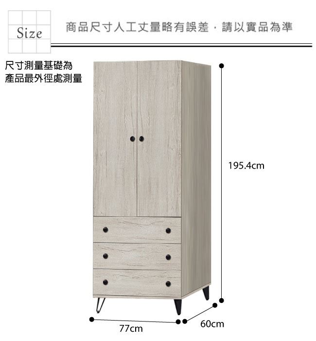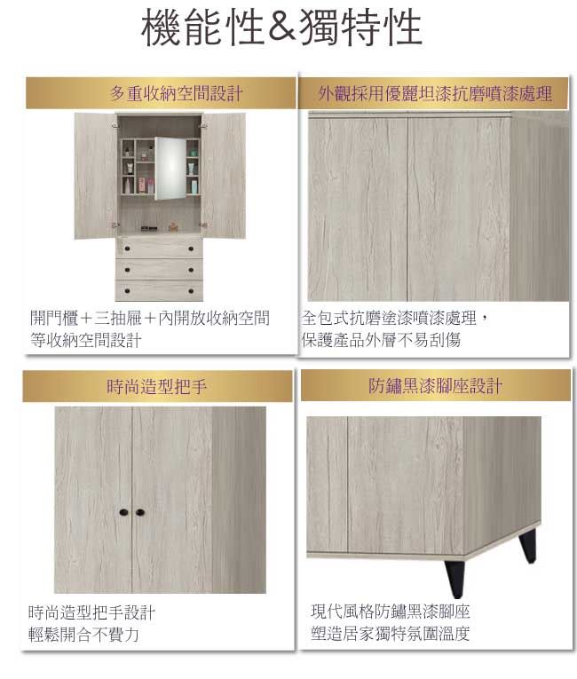 商品介紹 | 【綠家居】提菲芮 時尚2.6尺二門三抽衣櫃/收納櫃(內含化妝鏡面櫃設置) 淺橡木紋色系+現代簡約風格+安心材質製造,整體採用防蛀木心板+黑鐵砂腳座+防夾手緩衝門片五金+五金滑軌結構+強化玻璃鏡面等安心材質製造,外層採用全包式防潮耐磨噴漆處理搭配採用開門櫃+吊衣桿+三抽屜+內開放式收納層格+內含可開合使用化妝鏡面櫃設置等收納空間設計,全由專人配送到家,專業安心服務,替你省下更多時間! 【商品特色】 淺橡木紋色系+現代簡約風格+安心材質製造,使用放心+搭配居家更便利 採用防蛀木心板+黑鐵砂腳座+防夾手緩衝門片五金+五金滑軌結構+強化玻璃鏡面等安心材質製造 採用開門櫃+吊衣桿+三抽屜+內開放式收納層格+內含可開合使用化妝鏡面櫃設置等收納空間設計 此商品不需要DIY組立,此商品為組立後之成品 品質保證、專業設計、貼心服務 全由專人配送到家,專業安心服務,替您省下更多時間 |