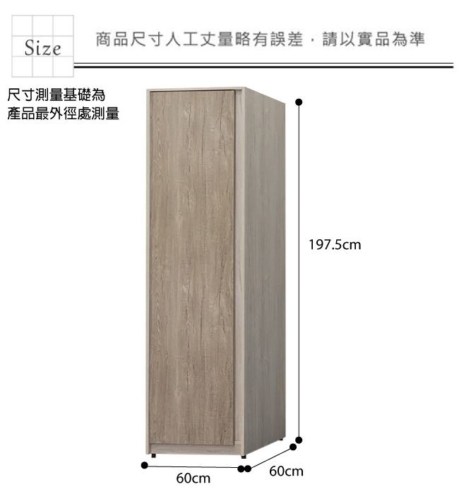 材質 | ◆產品名稱: 【綠家居】提韋克 時尚2尺單門單吊衣桿衣櫃/收納櫃 尺寸:(寬)60x(深)60x(高)197.5公分 ◆材質: 材質:防蛀木心板+防潮耐磨腳座+防夾手緩衝門片五金 外層採用全包式防潮耐磨噴漆處理