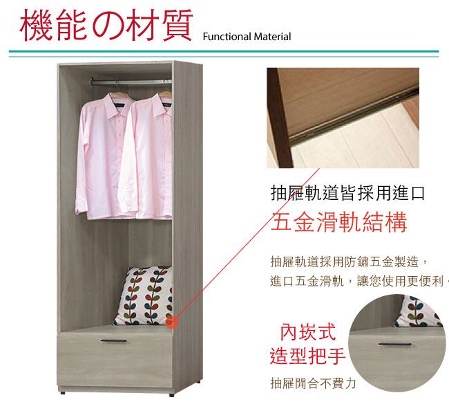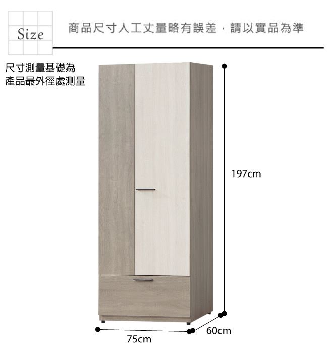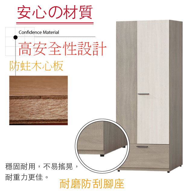 材質 | ◆產品名稱: 【綠家居】歐倫勒 雙色2.5尺二門單抽衣櫃/收納櫃 尺寸:(寬)75x(深)60x(高)197公分 ◆材質: 材質:防蛀木心板+防潮耐磨腳座+防夾手緩衝門片五金+五金滑軌結構 外層採用全包式防潮耐磨噴漆處理