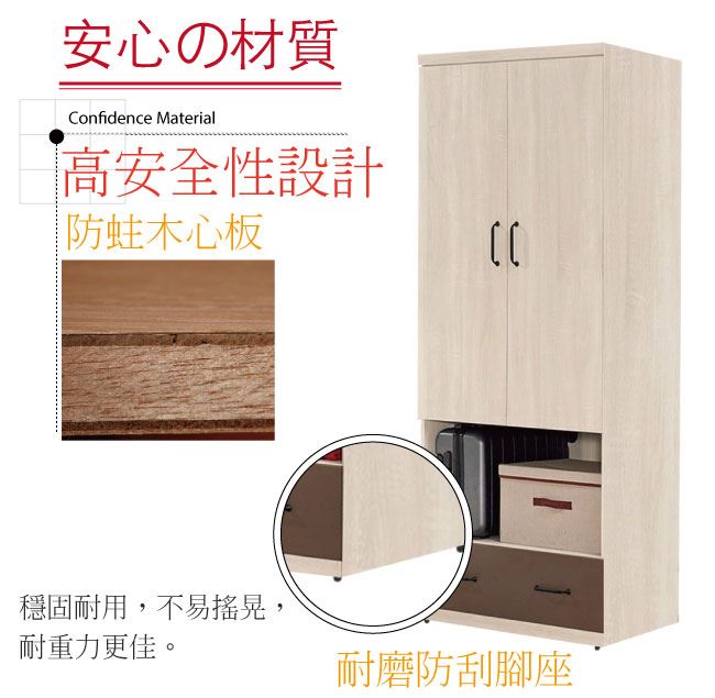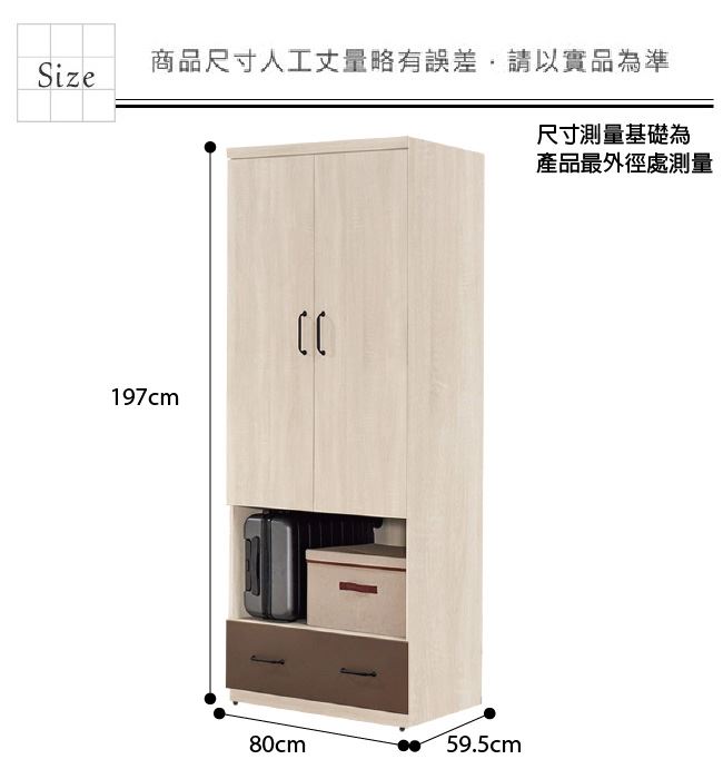 材質 | ◆產品名稱: 【綠家居】畢娜 雙色中空2.7尺二門單抽衣櫃 產品尺寸: 尺寸:(寬)80x(深)59.5x(高)197/公分 ◆材質: 材質:防蛀木心板+防潮耐磨腳座 材質:防夾手緩衝門片五金+五金滑軌結構 塗漆:優利坦全包式耐磨噴漆處理