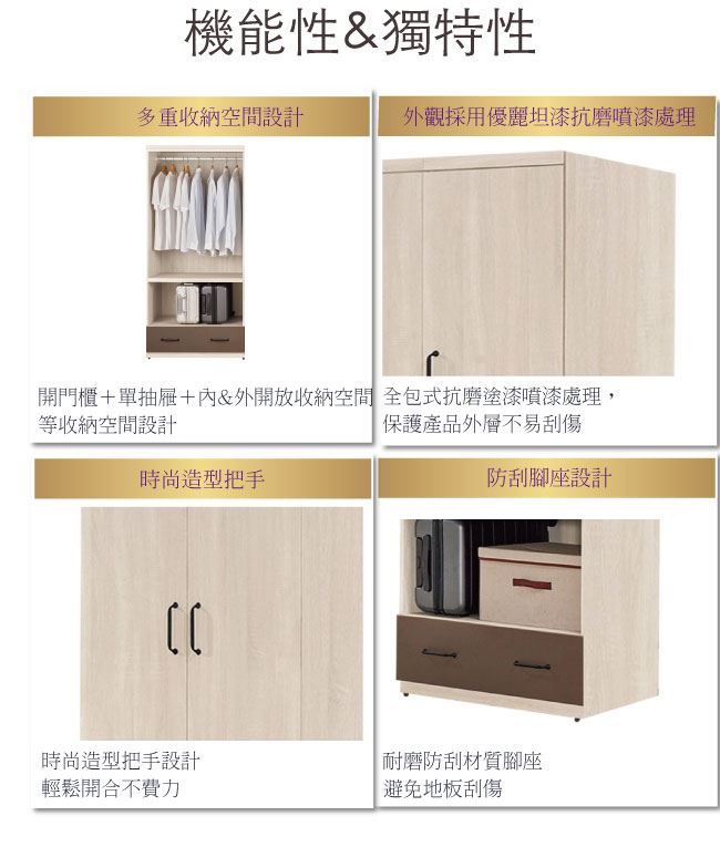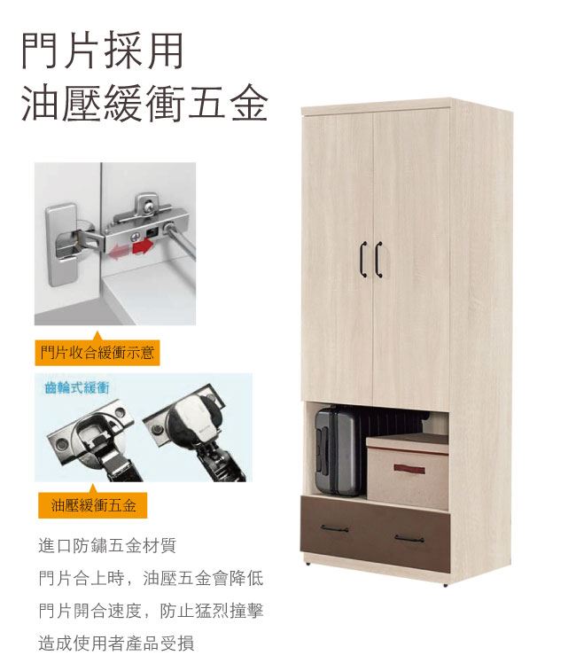 商品介紹 | 【綠家居】畢娜 雙色中空2.7尺二門單抽衣櫃 橡木紋雙色系+現代簡約風格+安心材質製造,整體採用防蛀木心板+防潮耐磨腳座+防夾手緩衝門片五金+五金滑軌結構等安心材質製造,外層採用優利坦全包式耐磨噴漆處理搭配開門櫃+吊衣桿+單抽屜+內&外開放式收納等收納空間設計,全由專人配送到家,專業安心服務,替你省下更多時間! 【商品特色】 橡木紋雙色系+現代簡約風格+安心材質製造,使用放心+搭配居家更便利 採用防蛀木心板+防潮耐磨腳座+防夾手緩衝門片五金+五金滑軌結構等安心材質製造 開門櫃+吊衣桿+單抽屜+內&外開放式收納等收納空間設計 此商品不需要DIY組立,此商品為組立後之成品 品質保證、專業設計、貼心服務 全由專人配送到家,專業安心服務,替您省下更多時間 |