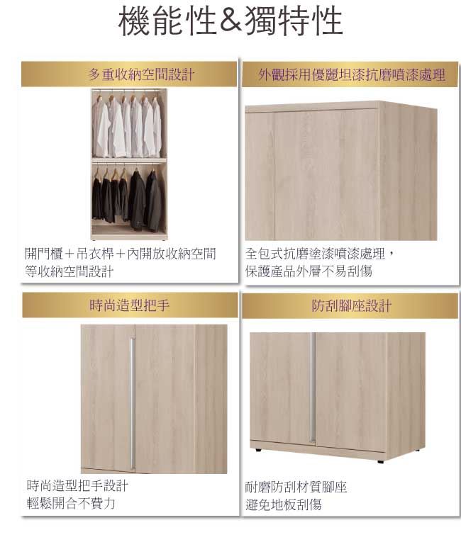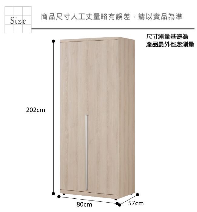 材質 | ◆產品名稱: 【綠家居】艾嘉柏 淺橡2.7尺二門雙吊桿衣櫃 產品尺寸: 尺寸:(寬)80x(深)57x(高)202/公分 ◆材質: 材質:防蛀木心板+防潮耐磨腳座 塗漆:優利坦全包式耐磨噴漆處理