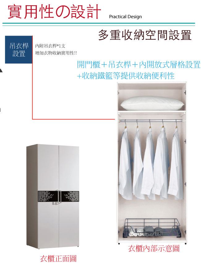 - 開門櫃+吊衣桿+拉合收納鐵籃