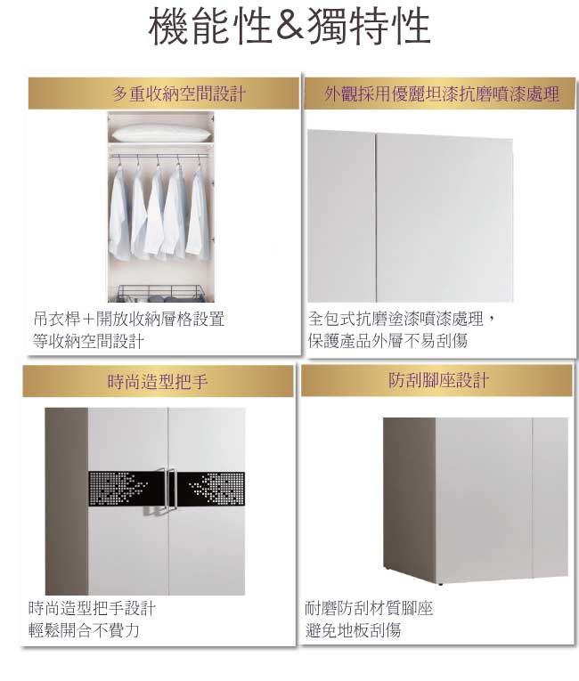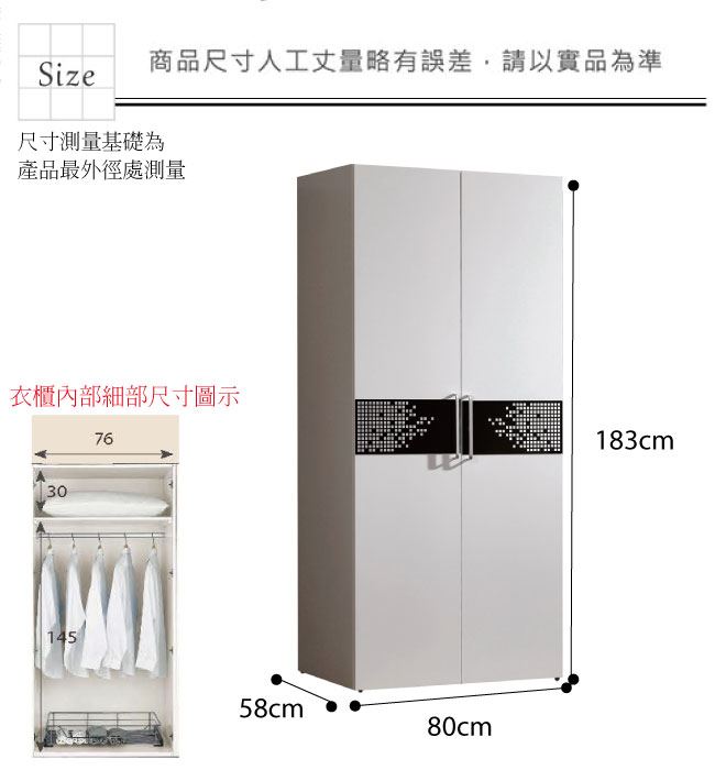 材質 | ◆產品名稱: 【綠家居】律法瑪 現代白2.7尺二門單吊鐵籃衣櫃 產品尺寸: 尺寸:(寬)80x(深)58x(高)183/公分 ◆材質: 材質:防蛀木心板+防潮MDF板材+防潮耐磨腳座+3mm強化玻璃飾板 塗漆:優利坦全包式亮面噴漆處理