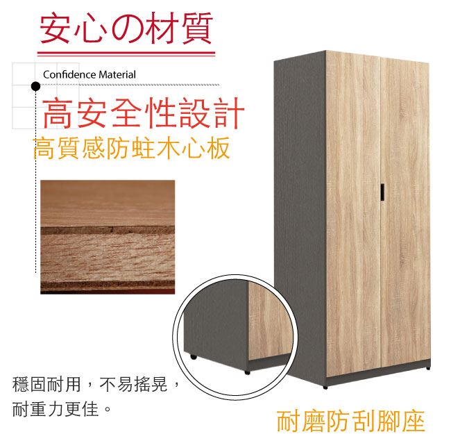 材質 | ◆產品名稱: 【綠家居】科羅利 雙色2.5尺二門雙吊衣櫃/收納櫃 尺寸:(寬)75.5x(深)57x(高)202/公分 ◆材質: 材質:防蛀木心板+防夾手緩衝門片五金+防潮耐磨腳座 噴漆:外層採用防潮耐磨噴漆處理