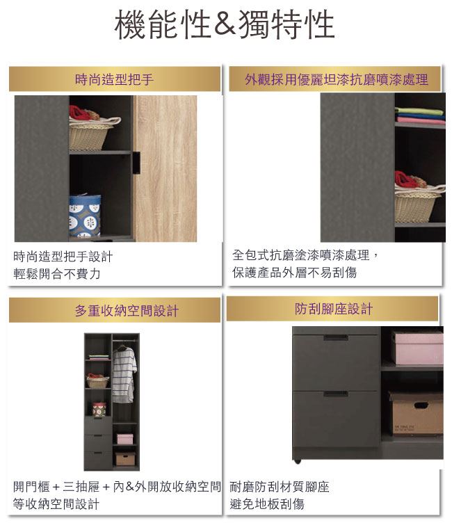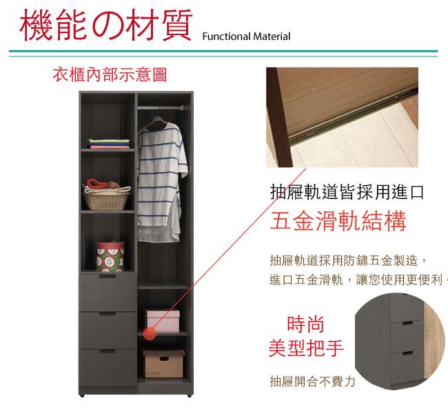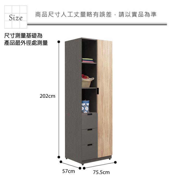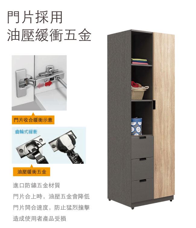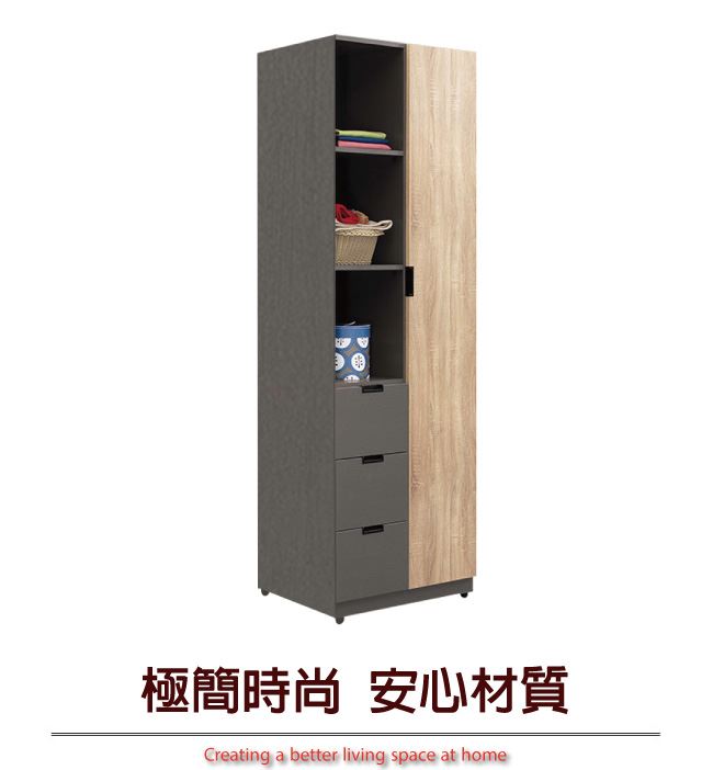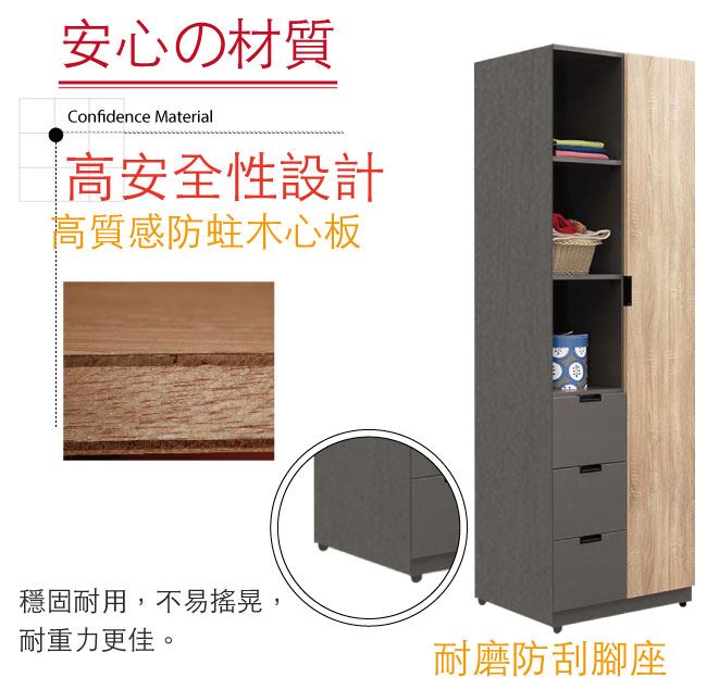 商品 介紹 | 【綠家居】科羅利 雙色2.5尺單門三抽衣櫃/收納櫃 木紋雙色+現代簡約風格+安心材質製造,整體採用防蛀木心板+防夾手緩衝門片五金+防潮耐磨腳座+五金滑軌結構等安心材質製造,搭配採用開門櫃+吊衣桿+三抽屜+內&外開放式層格等收納空間設計,全由專人配送到家,專業安心服務,替你省下更多時間! 【商品特色】 木紋雙色+現代簡約風格+安心材質製造,使用放心+搭配居家更便利 採用防蛀木心板+防夾手緩衝門片五金+防潮耐磨腳座+五金滑軌結構等安心材質製造 採用開門櫃+吊衣桿+三抽屜+內&外開放式層格等收納空間設計 此商品不需要DIY組立,此商品為組立後之成品 品質保證、專業設計、貼心服務 全由專人配送到家,專業安心服務,替您省下更多時間 |
