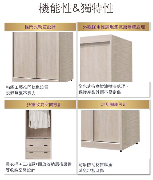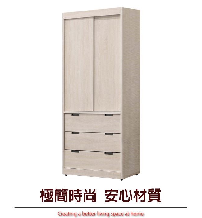 商品 介紹 | 【綠家居】維肯 時尚2.7尺推門雙吊衣櫃/收納櫃 淺橡木紋色系+現代簡約風格+安心材質製造,整體採用防蛀木心板+防潮耐磨腳座+五金滑軌結構等安心材質製造,搭配採用開門櫃+吊衣桿+三抽屜+內開放式層格等收納空間設計,全由專人配送到家,專業安心服務,替你省下更多時間! 【商品特色】 淺橡木紋色+現代簡約風格+安心材質製造,使用放心+搭配居家更便利 採用防蛀木心板+防潮耐磨腳座+五金滑軌結構等安心材質製造 採用開門櫃+吊衣桿+三抽屜+內開放式層格等收納空間設計 此商品不需要DIY組立,此商品為組立後之成品 品質保證、專業設計、貼心服務 全由專人配送到家,專業安心服務,替您省下更多時間 |