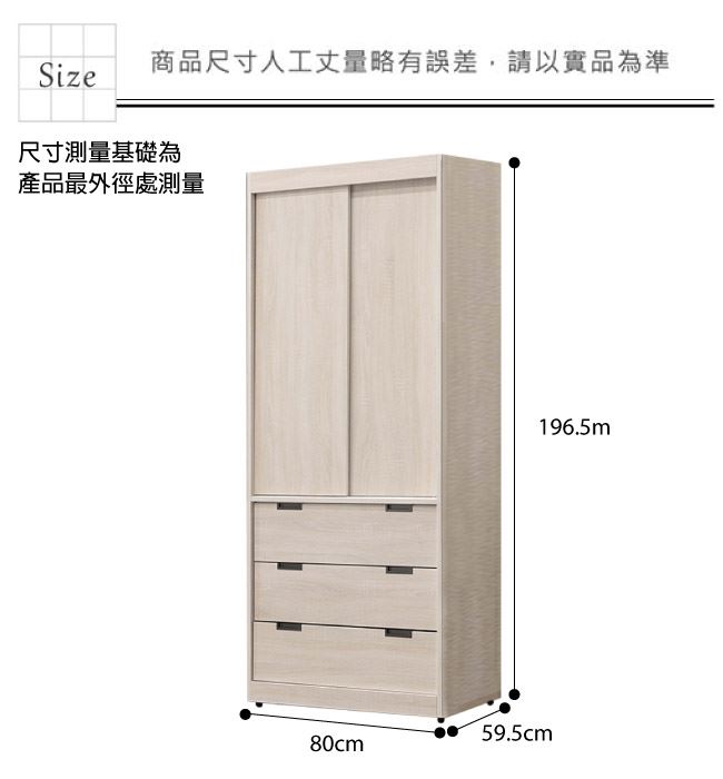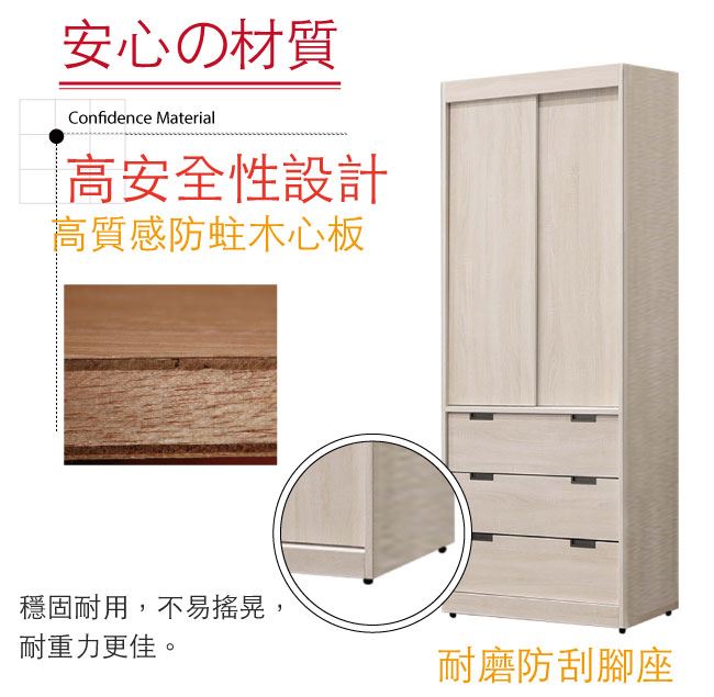 材質 | ◆產品名稱: 【綠家居】維肯 時尚2.7尺推門三抽衣櫃/收納櫃 尺寸:(寬)80x(深)59.5x(高)196.5/公分 ◆材質: 材質:防蛀木心板+防潮耐磨腳座+五金滑軌結構 噴漆:外層採用防潮耐磨噴漆處理
