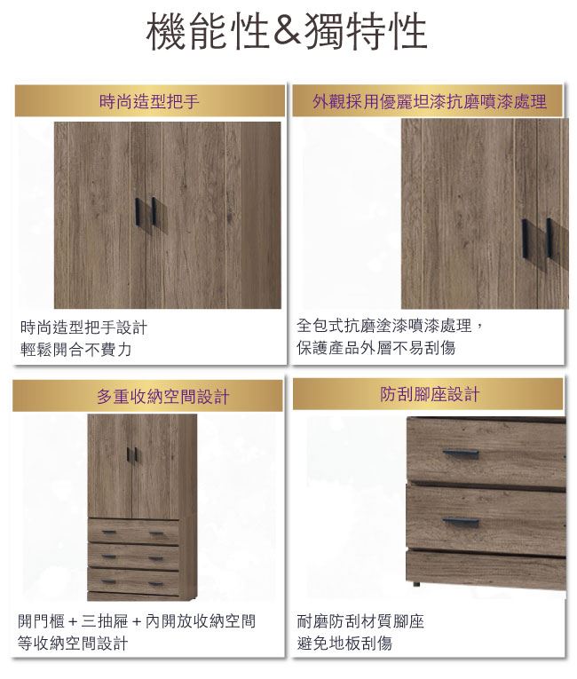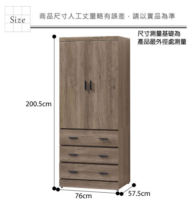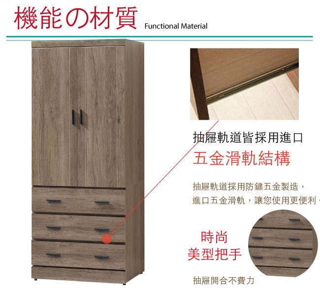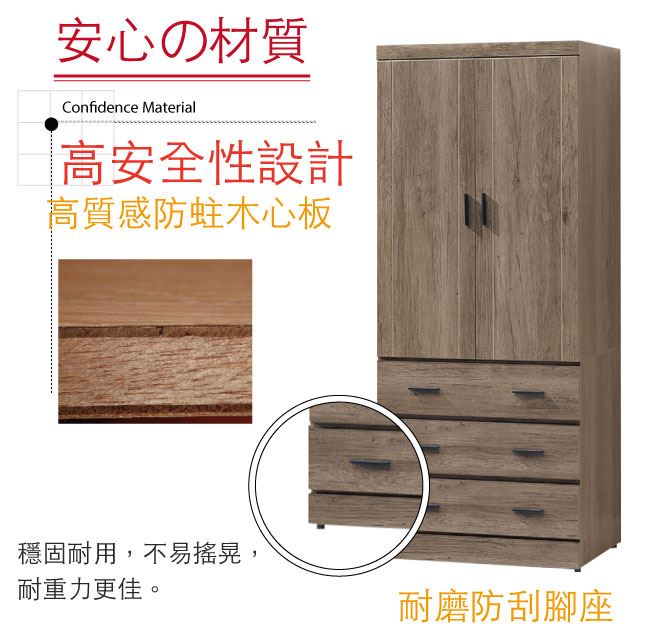 材質 | ◆產品名稱: 【綠家居】查莫 時尚2.5尺二門三抽衣櫃/收納櫃 尺寸:(寬)76x(深)57.5x(高)200.5/公分 ◆材質: 材質:防蛀木心板+五金滑軌結構+防潮耐磨腳座