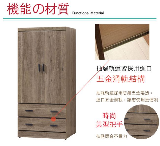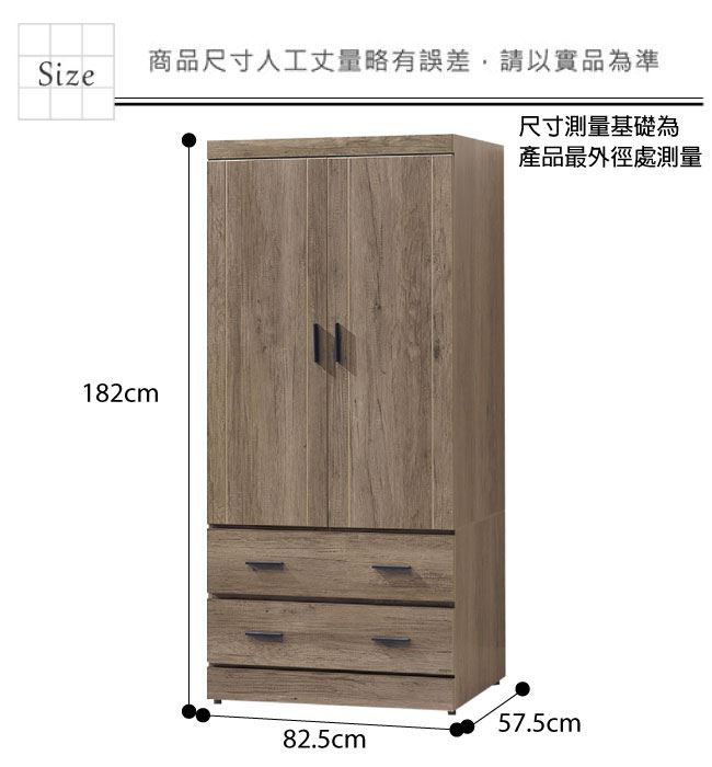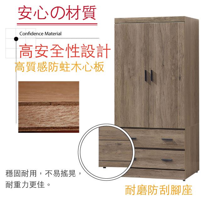 材質 | ◆產品名稱: 【綠家居】查查莫 時尚2.8尺二門二抽衣櫃/收納櫃 尺寸:(寬)82.5x(深)57.5x(高)182/公分 ◆材質: 材質:防蛀木心板+五金滑軌結構+防潮耐磨腳座
