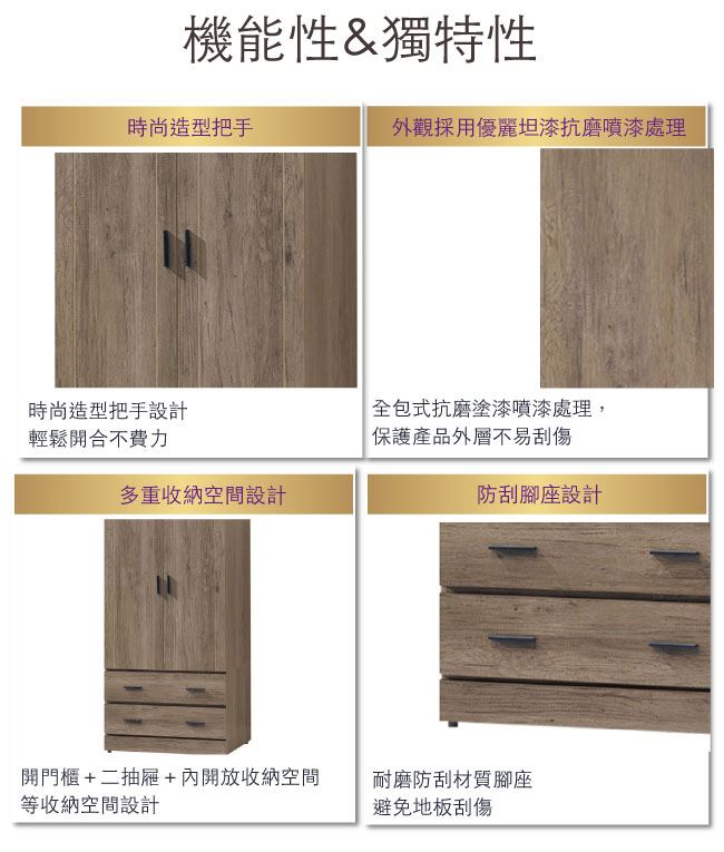 商品 介紹 | 【綠家居】查莫 時尚2.5尺二門三抽衣櫃/收納櫃 橡木紋色+現代簡約風格+安心材質製造,整體採用防蛀木心板+五金滑軌結構+防潮耐磨腳座等安心材質製造,搭配採用開門櫃+吊衣桿+三抽屜+內開放式收納層格等收納空間設計,全由專人配送到家,專業安心服務,替你省下更多時間! 【商品特色】 橡木紋色+現代簡約風格+安心材質製造,使用放心+搭配居家更便利 採用防蛀木心板+五金滑軌結構+防潮耐磨腳座等安心材質製造 採用開門櫃+吊衣桿+三抽屜+內開放式收納層格等收納空間設計 此商品不需要DIY組立,此商品為組立後之成品 品質保證、專業設計、貼心服務 全由專人配送到家,專業安心服務,替您省下更多時間 |