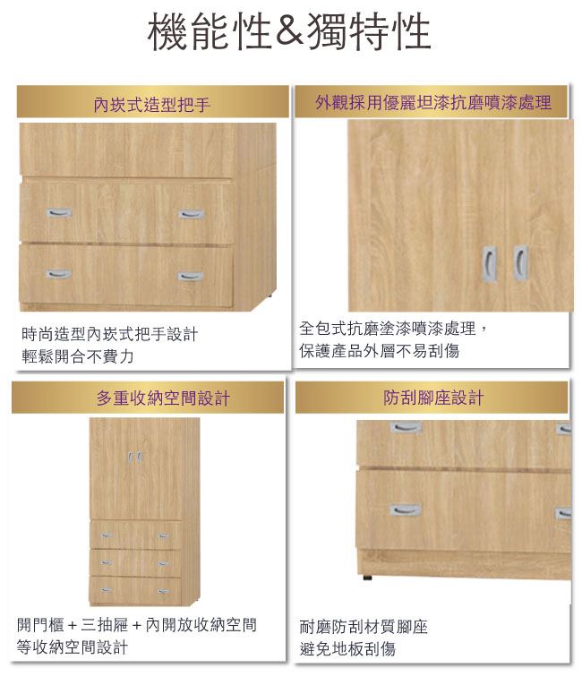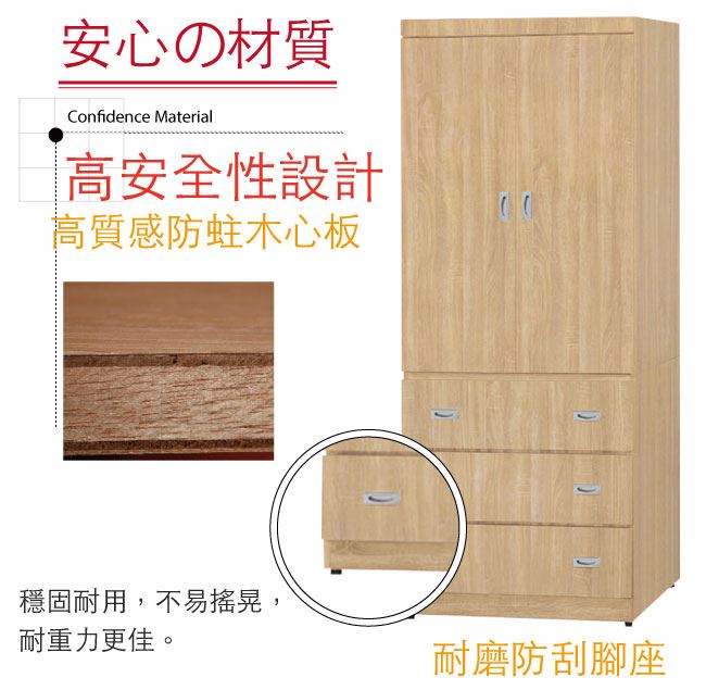 商品 介紹 | 【綠家居】比勒 時尚2.7尺二門三抽衣櫃/收納櫃(附穿衣鏡面)橡木紋色+現代簡約風格+安心材質製造,整體採用防蛀木心板+五金滑軌結構+防潮耐磨腳座等安心材質製造,搭配採用開門櫃+吊衣桿+二抽屜+穿衣鏡面+內開放式收納層格等收納空間設計,全由專人配送到家,專業安心服務,替你省下更多時間! 【商品特色】 橡木紋色+現代簡約風格+安心材質製造,使用放心+搭配居家更便利 採用防蛀木心板+五金滑軌結構+防潮耐磨腳座等安心材質製造 採用開門櫃+吊衣桿+二抽屜+穿衣鏡面+內開放式收納層格等收納空間設計 此商品不需要DIY組立,此商品為組立後之成品 品質保證、專業設計、貼心服務 全由專人配送到家,專業安心服務,替您省下更多時間 |