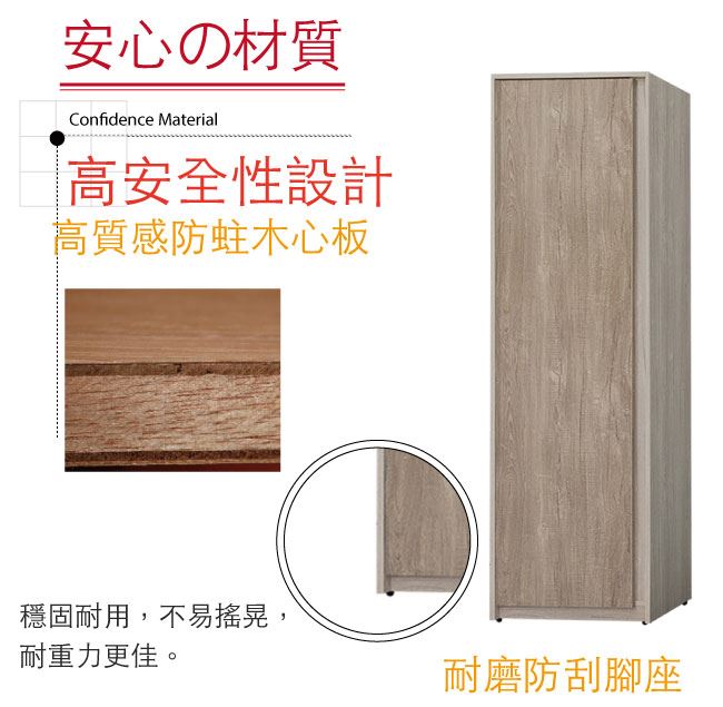 材質 | ◆產品名稱: 【綠家居】約哈爾 時尚2尺單門衣櫃/收納櫃 尺寸:(寬)60x(深)60x(高)197.5/公分 ◆材質: 材質:防蛀木心板+防潮耐磨腳座