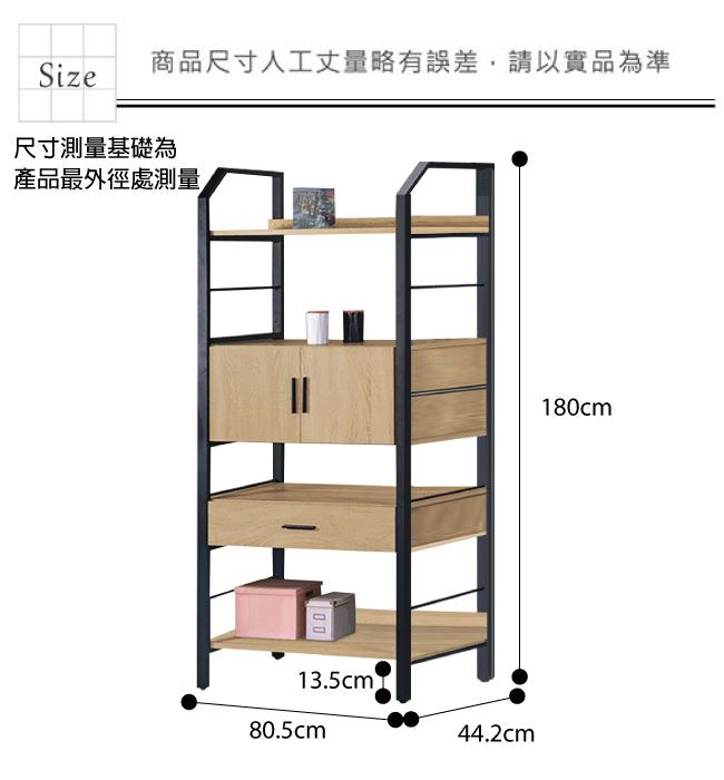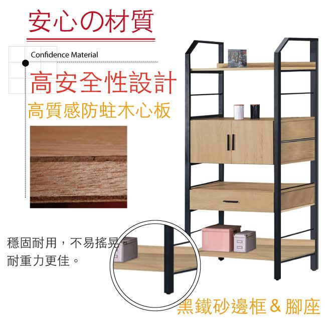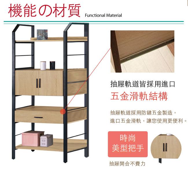 材質 | ◆產品名稱: 【綠家居】卡約納 時尚2.7尺二門單抽書櫃/收納櫃 尺寸:(寬)80.5x(深)44.2x(高)180/公分 ◆材質: 材質:防蛀木心板+黑鐵砂框架&腳座+五金滑軌結構