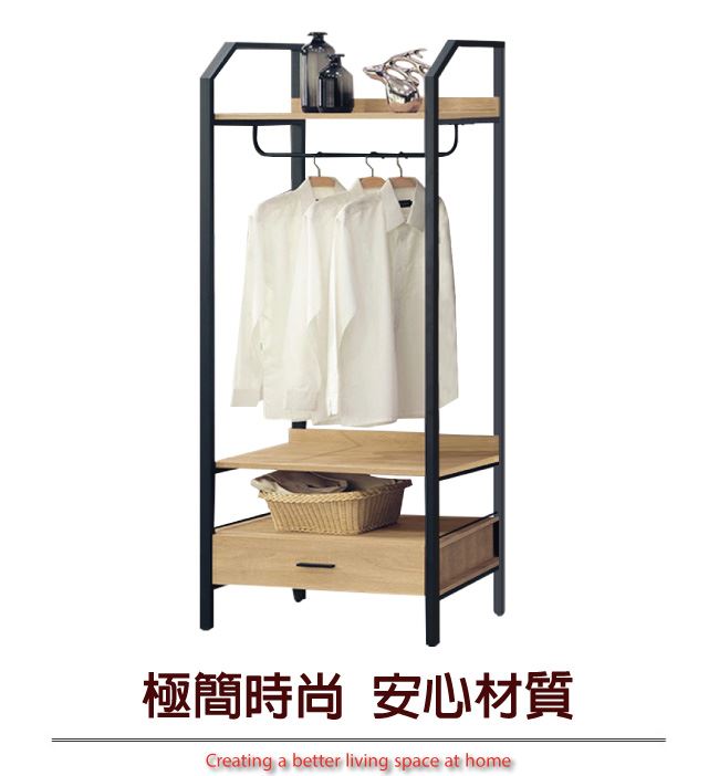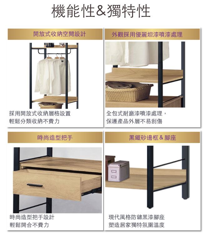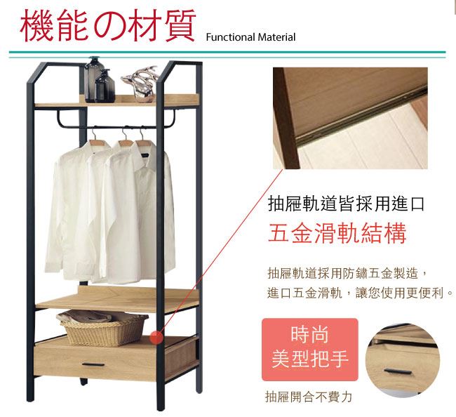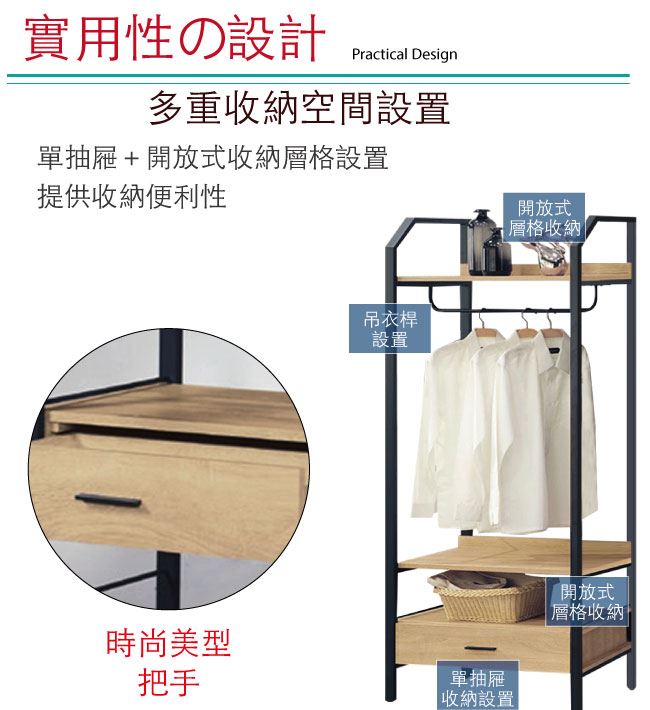 - 吊衣桿+單抽屜+開放式層格
