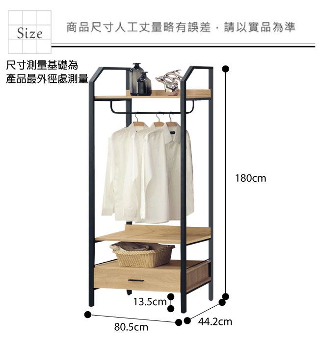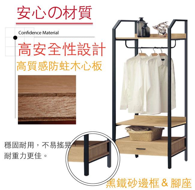 材質 | ◆產品名稱: 【綠家居】卡約納 時尚2.7尺單抽吊衣櫃/收納櫃 尺寸:(寬)80.5x(深)44.2x(高)180/公分 ◆材質: 材質:防蛀木心板+黑鐵砂框架&腳座+五金滑軌結構