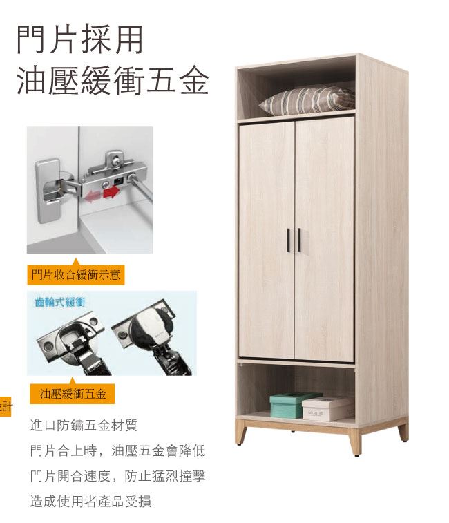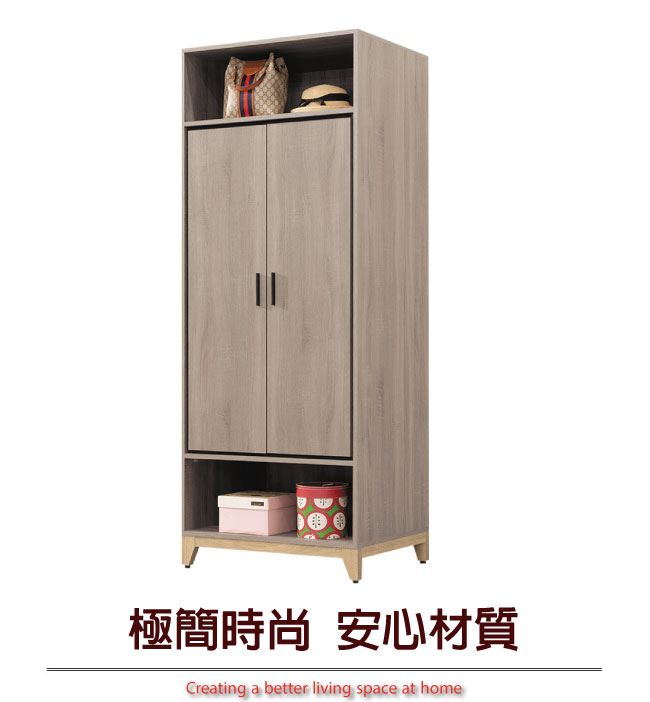 商品 介紹 | 【綠家居】查德 時尚2.5尺二門單吊衣櫃(二色可選) 二色可選+現代簡約風格+安心材質製造,整體採用防蛀木心板+防夾手緩衝五金結構+防潮耐磨腳座等安心材質製造,外層採用優利坦全包式耐磨噴漆處理搭配開門櫃+吊衣桿+內&外開放式層格等收納設計,全由專人配送到家,專業安心服務,替你省下更多時間! 【商品特色】 二色可選+現代簡約風格+安心材質製造,使用放心+搭配居家更便利 採用防蛀木心板+防夾手緩衝五金結構+防潮耐磨腳座等安心材質製造 開門櫃+吊衣桿+內&外開放式層格等收納設計 此商品不需要DIY組立,此商品為組立後之成品 品質保證、專業設計、貼心服務 全由專人配送到家,專業安心服務,替您省下更多時間 |