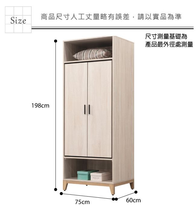 材質 | ◆產品名稱: 【綠家居】查德 時尚2.5尺二門單吊衣櫃(二色可選) 產品尺寸: 尺寸:(寬)75x(深)60x(高)198/公分 ◆材質: 材質:防蛀木心板+防潮耐磨腳座 材質:防夾手緩衝五金結構 塗漆:優利坦全包式耐磨噴漆處理