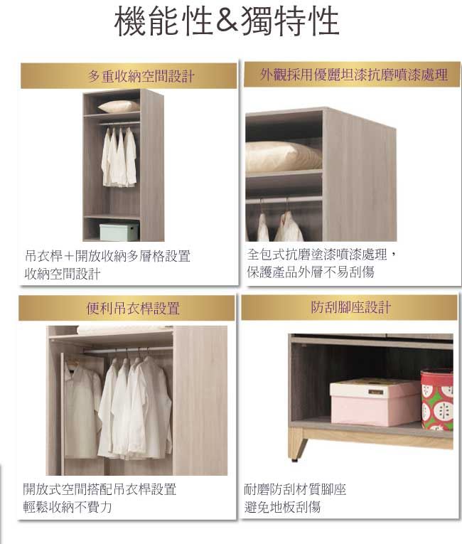 商品 介紹 | 【綠家居】查德 時尚2.5尺開放式單吊衣櫃(二色可選) 二色可選+現代簡約風格+安心材質製造,整體採用防蛀木心板+防潮耐磨腳座等安心材質製造,外層採用優利坦全包式耐磨噴漆處理搭配吊衣桿+開放式層格等收納設計,全由專人配送到家,專業安心服務,替你省下更多時間! 【商品特色】 二色可選+現代簡約風格+安心材質製造,使用放心+搭配居家更便利 採用防蛀木心板+防潮耐磨腳座等安心材質製造 吊衣桿+開放式層格等收納設計 此商品不需要DIY組立,此商品為組立後之成品 品質保證、專業設計、貼心服務 全由專人配送到家,專業安心服務,替您省下更多時間 |
