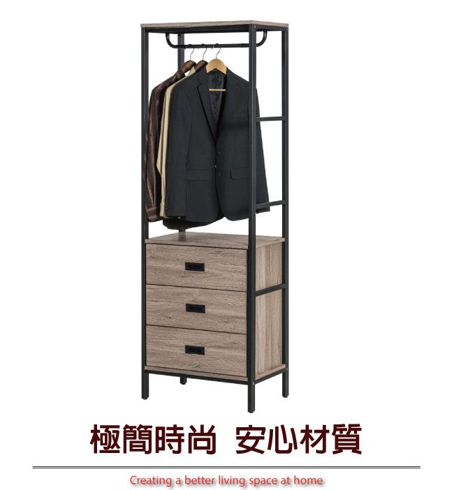 商品 介紹 | 【綠家居】卡法意 時尚2尺三抽半開放式衣櫃/收納櫃 木紋雙色系+現代簡約風格+安心材質製造,鏡台整體採用防蛀木心板+黑鐵砂邊框&腳座+五金滑軌結構等安心材質製造,外層採用優利坦全包式耐磨噴漆處理搭配三抽屜+吊衣桿+開放式層格等收納空間設計,全由專人配送到家,專業安心服務,替你省下更多時間! 【商品特色】 木紋雙色系+現代簡約風格+安心材質製造,使用放心+搭配居家更便利 採用防蛀木心板+黑鐵砂邊框&腳座+五金滑軌結構等安心材質製造 三抽屜+吊衣桿+開放式層格等收納空間設計 此商品不需要DIY組立,此商品為組立後之成品 品質保證、專業設計、貼心服務 全由專人配送到家,專業安心服務,替您省下更多時間 |
