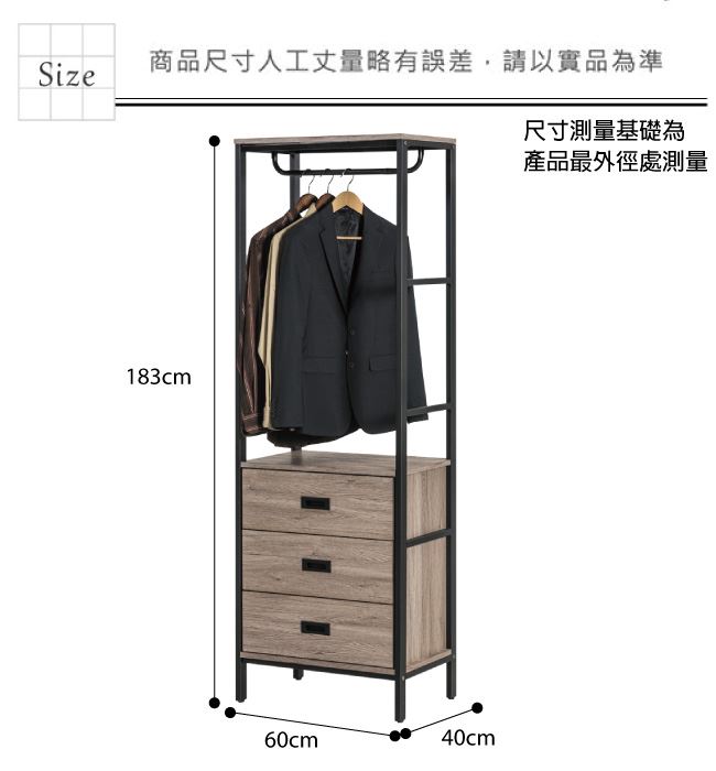 材質 | ◆產品名稱: 【綠家居】卡法意 時尚2尺三抽半開放式衣櫃/收納櫃 產品尺寸: 尺寸:(寬)60x(深)40x(高)183/公分 ◆材質: 材質:防蛀木心板+黑鐵砂邊框&腳座+五金滑軌結構 塗漆:優利坦全包式耐磨噴漆處理