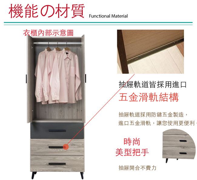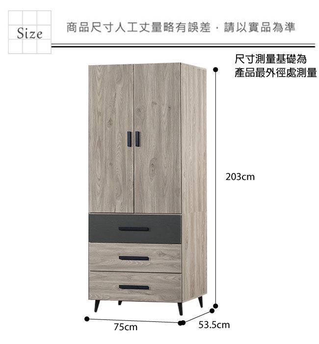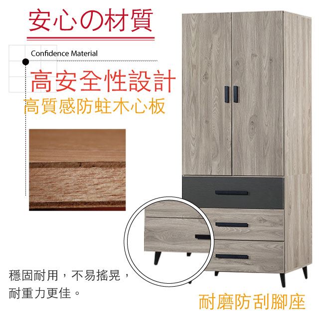 材質 | ◆產品名稱: 【綠家居】佩芮 時尚2.5尺二門三抽衣櫃/收納櫃 尺寸:(寬)75x(深)53.5x(高)203/公分 ◆材質: 材質:防蛀木心板+防夾手緩衝門片五金結構+防鏽黑漆腳座+五金滑軌結構 外層採用全包式防潮耐磨噴漆處理