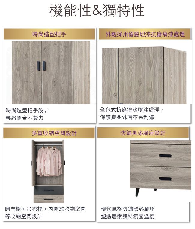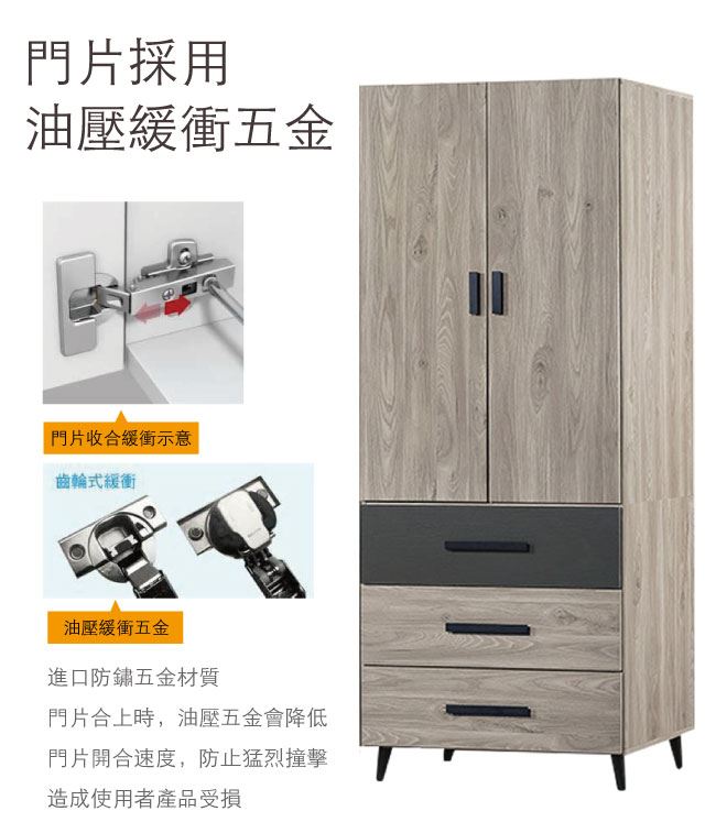 商 品 介 紹 | 【綠家居】佩芮 時尚2.5尺二門三抽衣櫃/收納櫃 橡木紋色+現代簡約風格+安心材質製造,整體採用防蛀木心板+防夾手緩衝門片五金結構+防鏽黑漆腳座+五金滑軌結構等安心材質製造,外層採用全包式防潮耐磨噴漆處理搭配採用開門櫃+三抽屜+吊衣桿+內開放式收納層格等收納空間設計,全由專人配送到家,專業安心服務,替你省下更多時間! 【商品特色】 橡木紋色+現代簡約風格+安心材質製造,使用放心+搭配居家更便利 採用防蛀木心板+防夾手緩衝門片五金結構+防鏽黑漆腳座+五金滑軌結構等安心材質製造 採用開門櫃+吊衣桿+三抽屜+內開放式收納層格等收納空間設計 此商品不需要DIY組立,此商品為組立後之成品 品質保證、專業設計、貼心服務 全由專人配送到家,專業安心服務,替您省下更多時間 |