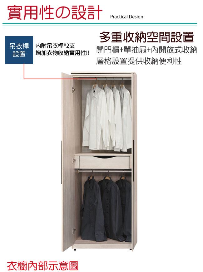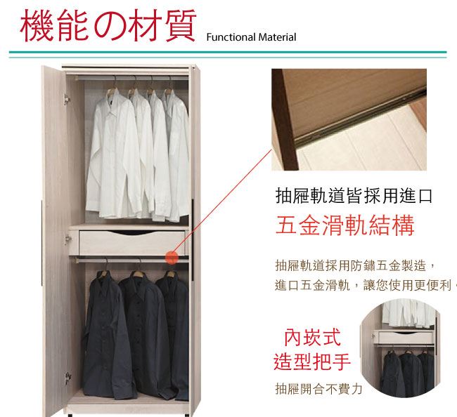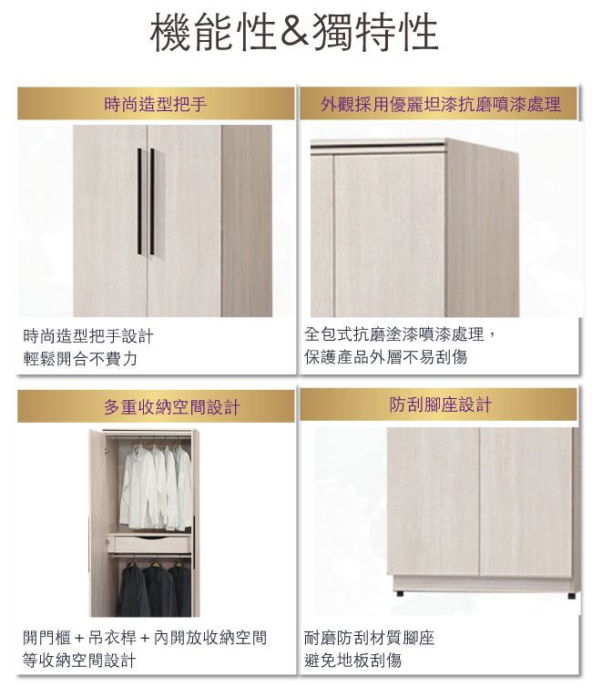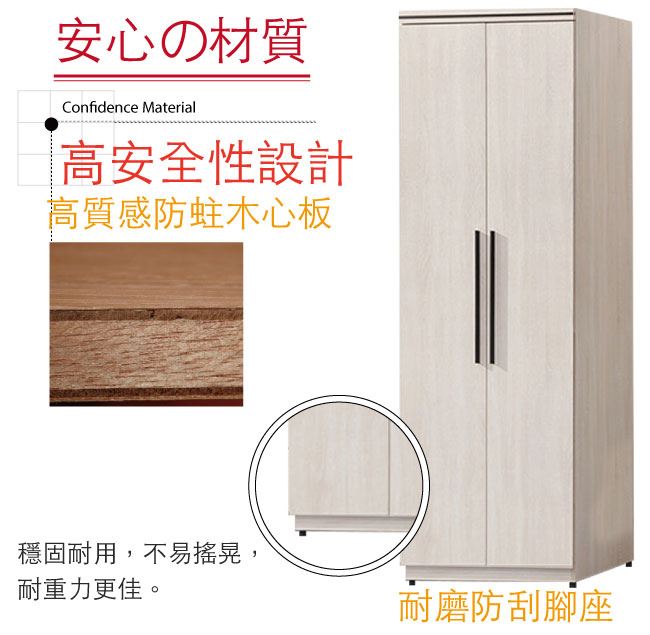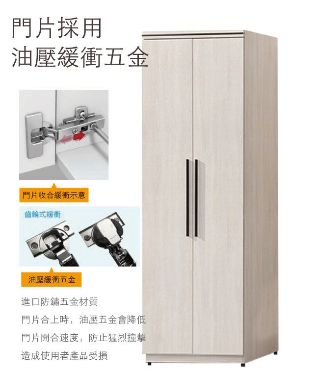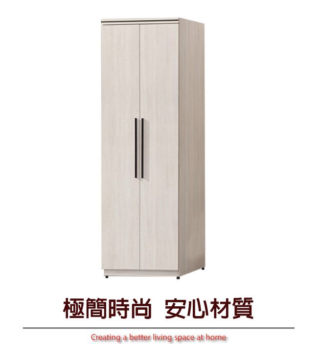 商 品 介 紹 | 【綠家居】提米 時尚2.5尺二門雙吊衣桿衣櫃/收納櫃 淺橡木紋色+現代簡約風格+安心材質製造,整體採用防蛀木心板+防夾手緩衝門片五金結構+防潮耐磨腳座等安心材質製造,外層採用全包式防潮耐磨噴漆處理搭配採用開門櫃+吊衣桿+內開放式收納層格等收納空間設計,全由專人配送到家,專業安心服務,替你省下更多時間! 【商品特色】 淺橡木紋色+現代簡約風格+安心材質製造,使用放心+搭配居家更便利 採用防蛀木心板+防夾手緩衝門片五金結構+防潮耐磨腳座等安心材質製造 採用開門櫃+吊衣桿+內開放式收納層格等收納空間設計 此商品不需要DIY組立,此商品為組立後之成品 品質保證、專業設計、貼心服務 全由專人配送到家,專業安心服務,替您省下更多時間 |