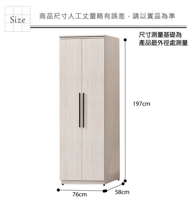 材質 | ◆產品名稱: 【綠家居】提米 時尚2.5尺二門雙吊衣桿衣櫃/收納櫃 尺寸:(寬)76x(深)58x(高)197/公分 ◆材質: 材質:防蛀木心板+防夾手緩衝門片五金結構+防潮耐磨腳座 外層採用全包式防潮耐磨噴漆處理