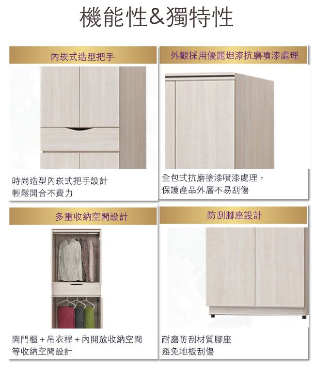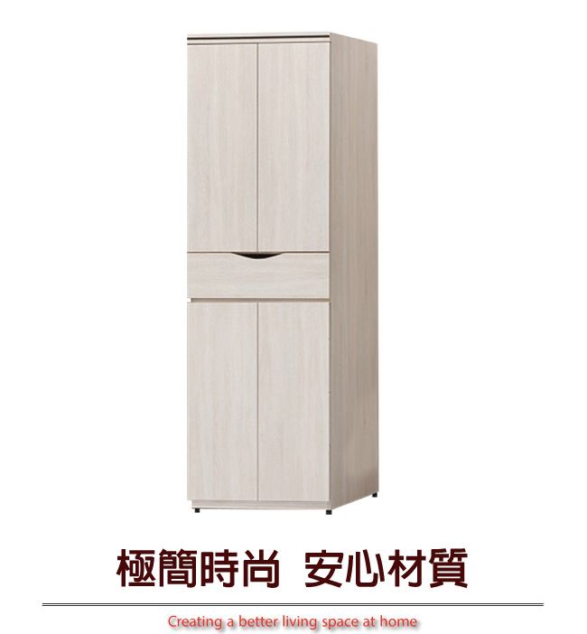 商 品 介 紹 | 【綠家居】提米 時尚2.5尺四門單抽衣櫃/收納櫃 淺橡木紋色+現代簡約風格+安心材質製造,整體採用防蛀木心板+防夾手緩衝門片五金結構+防潮耐磨腳座+五金滑軌結構等安心材質製造,外層採用全包式防潮耐磨噴漆處理搭配採用開門櫃+單抽屜+吊衣桿+內開放式收納層格等收納空間設計,全由專人配送到家,專業安心服務,替你省下更多時間! 【商品特色】 淺橡木紋色+現代簡約風格+安心材質製造,使用放心+搭配居家更便利 採用防蛀木心板+防夾手緩衝門片五金結構+防潮耐磨腳座+五金滑軌結構等安心材質製造 採用開門櫃+吊衣桿+單抽屜+內開放式收納層格等收納空間設計 此商品不需要DIY組立,此商品為組立後之成品 品質保證、專業設計、貼心服務 全由專人配送到家,專業安心服務,替您省下更多時間 |