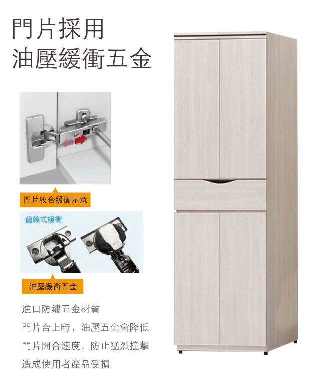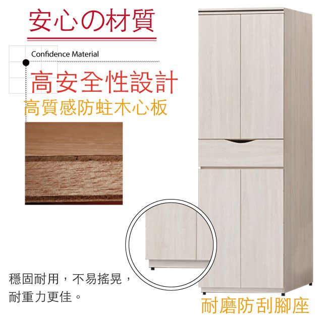 材質 | ◆產品名稱: 【綠家居】提米 時尚2.5尺四門單抽衣櫃/收納櫃 尺寸:(寬)76x(深)58x(高)197/公分 ◆材質: 材質:防蛀木心板+防夾手緩衝門片五金結構+防潮耐磨腳座+五金滑軌結構 外層採用全包式防潮耐磨噴漆處理
