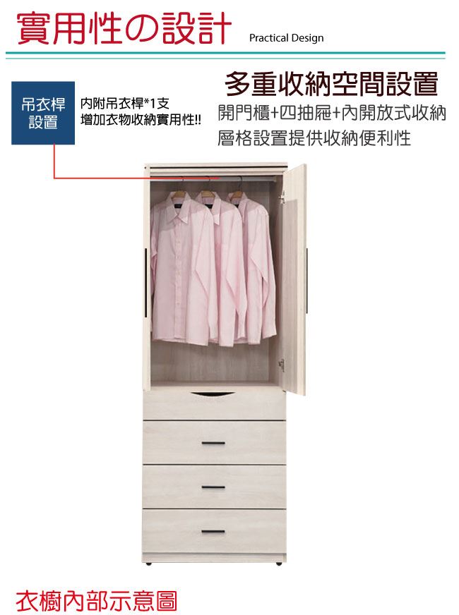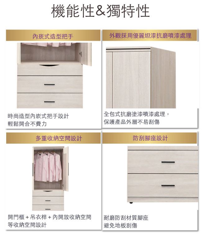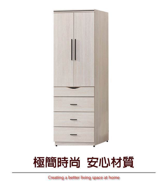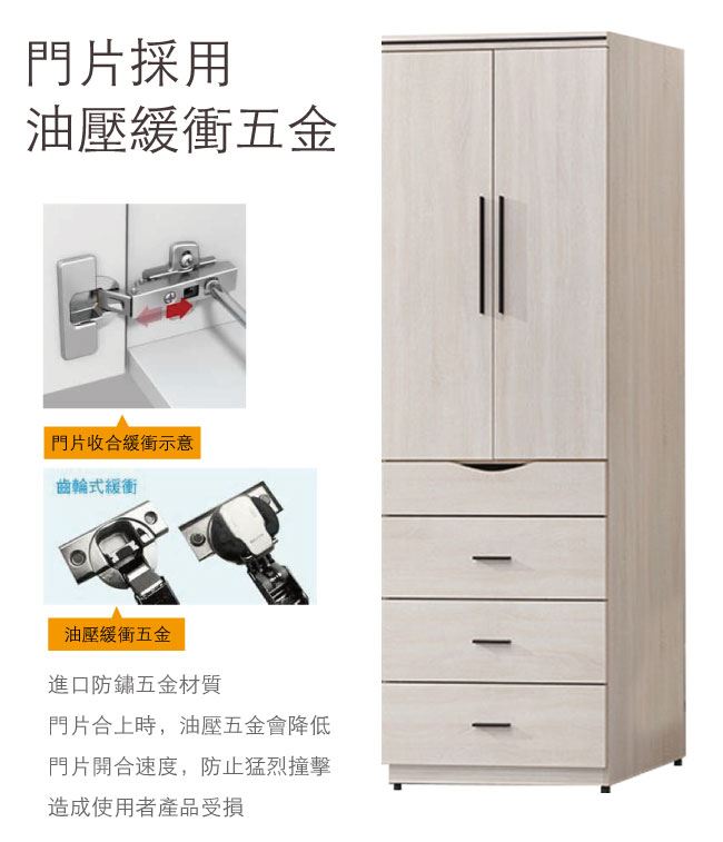 商 品 介 紹 | 【綠家居】提米 時尚2.5尺二門四抽衣櫃/收納櫃 淺橡木紋色+現代簡約風格+安心材質製造,整體採用防蛀木心板+防夾手緩衝門片五金結構+防潮耐磨腳座+五金滑軌結構等安心材質製造,外層採用全包式防潮耐磨噴漆處理搭配採用開門櫃+四抽屜+吊衣桿+內開放式收納層格等收納空間設計,全由專人配送到家,專業安心服務,替你省下更多時間! 【商品特色】 淺橡木紋色+現代簡約風格+安心材質製造,使用放心+搭配居家更便利 採用防蛀木心板+防夾手緩衝門片五金結構+防潮耐磨腳座+五金滑軌結構等安心材質製造 採用開門櫃+吊衣桿+四抽屜+內開放式收納層格等收納空間設計 此商品不需要DIY組立,此商品為組立後之成品 品質保證、專業設計、貼心服務 全由專人配送到家,專業安心服務,替您省下更多時間 |