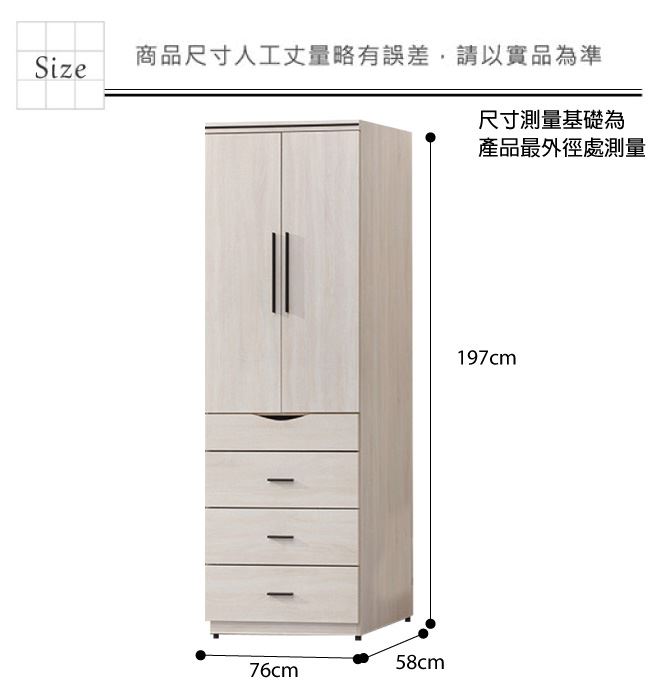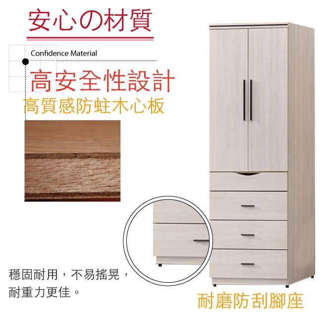 材質 | ◆產品名稱: 【綠家居】提米 時尚2.5尺二門四抽衣櫃/收納櫃 尺寸:(寬)76x(深)58x(高)197/公分 ◆材質: 材質:防蛀木心板+防夾手緩衝門片五金結構+防潮耐磨腳座+五金滑軌結構 外層採用全包式防潮耐磨噴漆處理