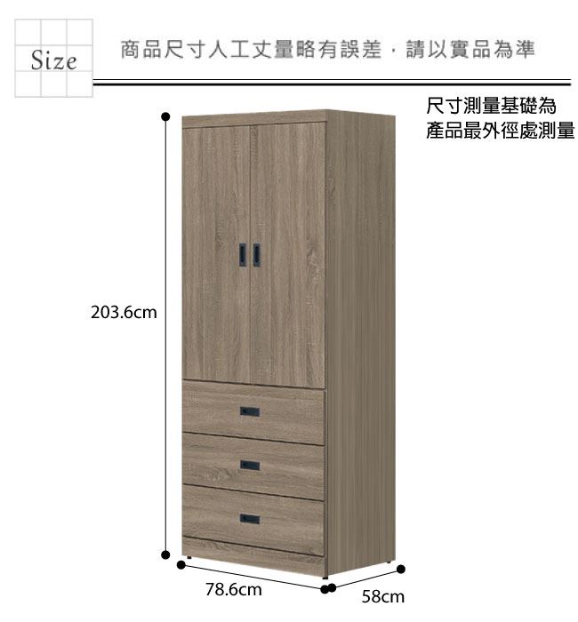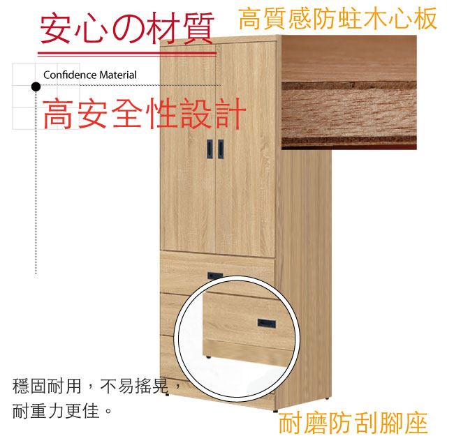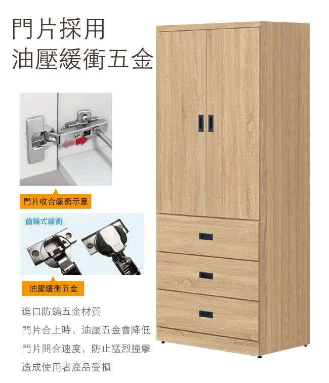 材質 | ◆產品名稱: 【綠家居】梅維 時尚2.6尺二門三抽衣櫃/收納櫃(四色可選) 尺寸:(寬)78.6x(深)58x(高)203.6/公分 ◆材質: 材質:防蛀木心板+防夾手緩衝門片五金結構+防潮耐磨腳座+五金滑軌結構 外層採用全包式防潮耐磨噴漆處理