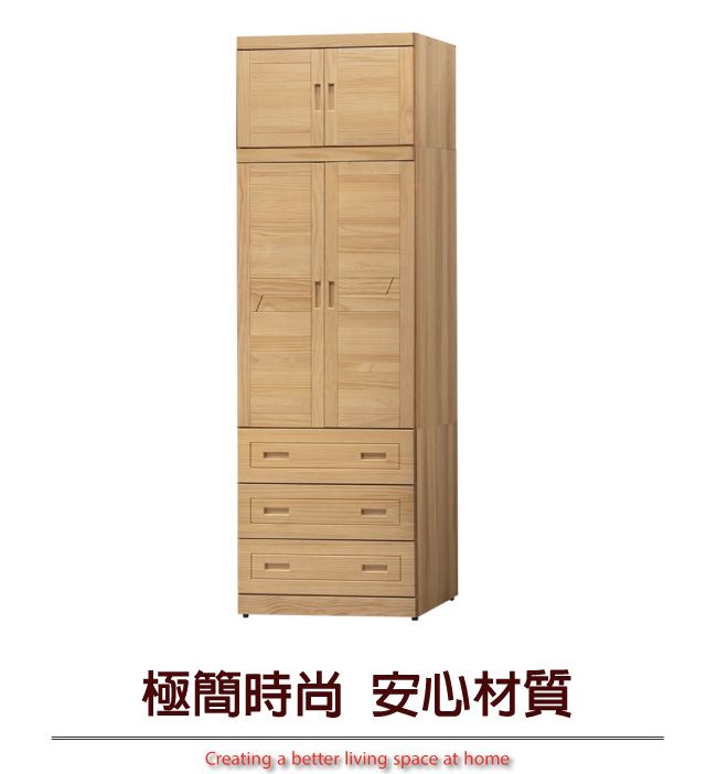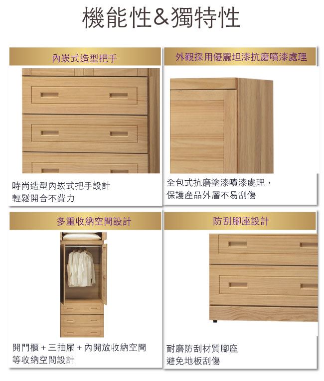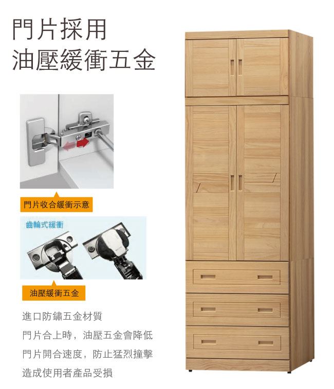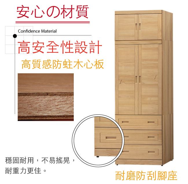 商 品 介 紹 | 【綠家居】哥倫 加高2.6尺四門三抽衣櫃/收納櫃組合 原木紋色系+現代簡約風格+安心材質製造,整體採用防蛀木心板+防夾手緩衝門片五金結構+防潮耐磨腳座+五金滑軌結構等安心材質製造,外層採用全包式防潮耐磨噴漆處理搭配採用開門櫃+三抽屜+吊衣桿+內開放式收納層格等收納空間設計,全由專人配送到家,專業安心服務,替你省下更多時間! 【商品特色】 原木紋色系+現代簡約風格+安心材質製造,使用放心+搭配居家更便利 採用防蛀木心板+防夾手緩衝門片五金結構+防潮耐磨腳座+五金滑軌結構等安心材質製造 採用開門櫃+吊衣桿+三抽屜+內開放式收納層格等收納空間設計 此商品不需要DIY組立,此商品為組立後之成品 品質保證、專業設計、貼心服務 全由專人配送到家,專業安心服務,替您省下更多時間 |