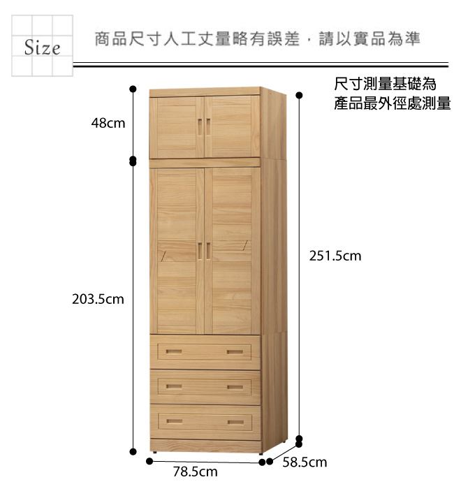 材質 | ◆產品名稱: 【綠家居】哥倫 加高2.6尺四門三抽衣櫃/收納櫃組合 尺寸:(寬)78.5x(深)58.5x(高)251.5/公分 ◆材質: 材質:防蛀木心板+防夾手緩衝門片五金結構+防潮耐磨腳座+五金滑軌結構 外層採用全包式防潮耐磨噴漆處理