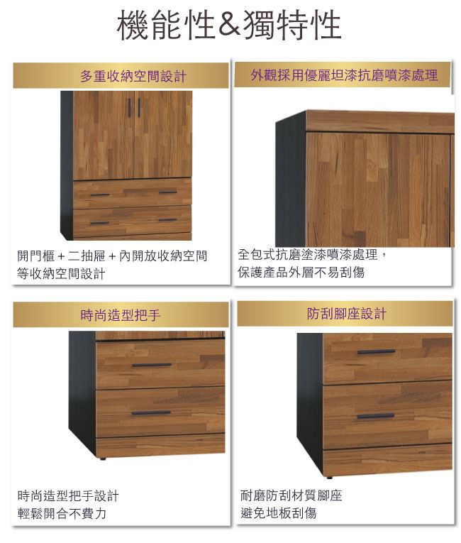 商 品 介 紹 | 【綠家居】麥菲凱 時尚2.7尺二門二抽衣櫃/收納櫃 木紋雙色系+現代簡約風格+安心材質製造,整體採用防蛀木心板+防潮耐磨腳座+五金滑軌結構+防夾手緩衝門片五金等安心材質製造,外層採用全包式防潮耐磨噴漆處理搭配採用開門櫃+吊衣桿+三抽屜+內開放式收納層格等收納空間設計,全由專人配送到家,專業安心服務,替你省下更多時間! 【商品特色】 木紋雙色系+現代簡約風格+安心材質製造,使用放心+搭配居家更便利 採用防蛀木心板+防潮耐磨腳座+五金滑軌結構+防夾手緩衝門片五金等安心材質製造 採用開門櫃+吊衣桿+二抽屜+內開放式收納層格等收納空間設計 此商品不需要DIY組立,此商品為組立後之成品 品質保證、專業設計、貼心服務 全由專人配送到家,專業安心服務,替您省下更多時間 |