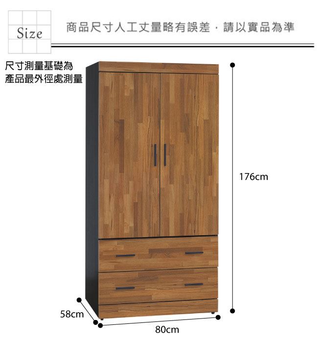 材質 | ◆產品名稱: 【綠家居】麥菲凱 時尚2.7尺二門二抽衣櫃/收納櫃 尺寸:(寬)80x(深)58x(高)176公分 ◆材質: 材質:防蛀木心板+防潮耐磨腳座+五金滑軌結構+防夾手緩衝門片五金 外層採用全包式防潮耐磨噴漆處理
